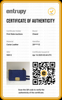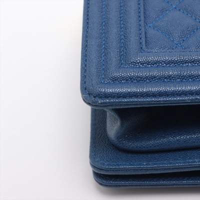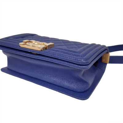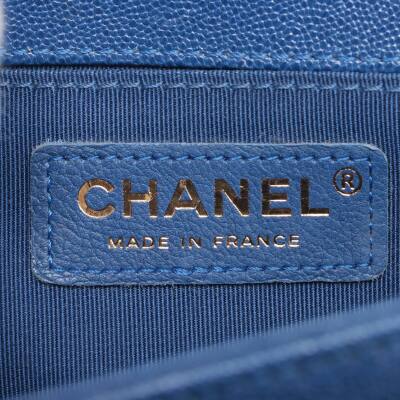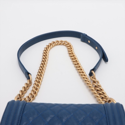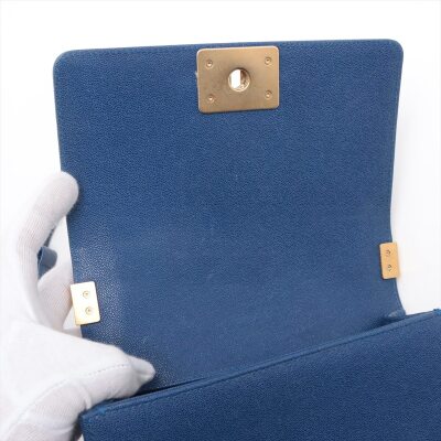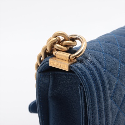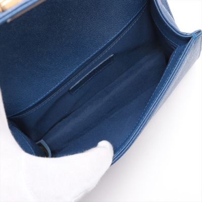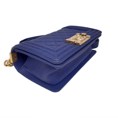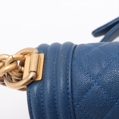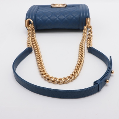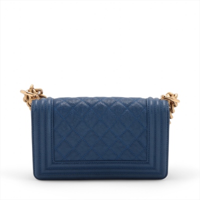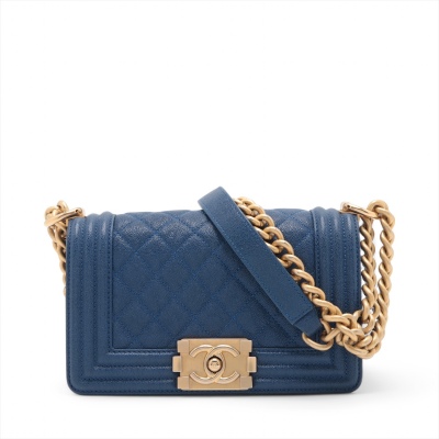 Chanel small Boy flap bag in diamond-quilted blue caviar leather with linear quilted border (#28xxxxxx). Featuring antique gold-toned hardware, front flap with Chanel boy logo press-lock closure. This opens to a blue textile interior with a patch pocket. Approximate dimensions: 20cm(L) x 12cm(H) x 6.5cm(D), chain strap drop 55cm. Accompanied by a Chanel dustbag. With Entrupy Certificate of Authenticity. (Pre-owned)