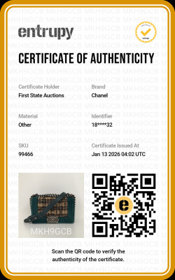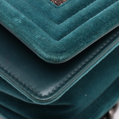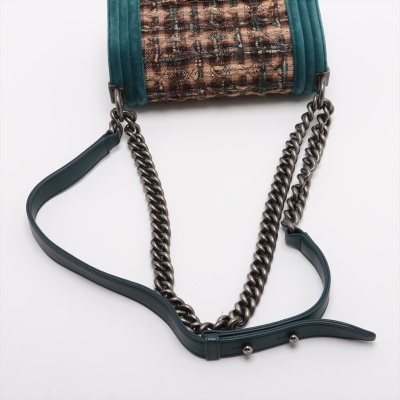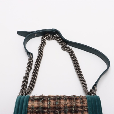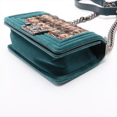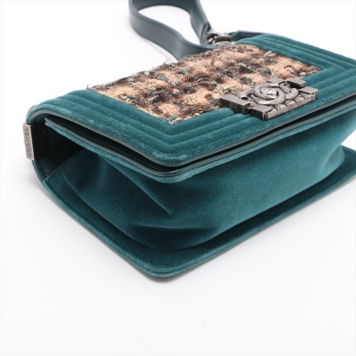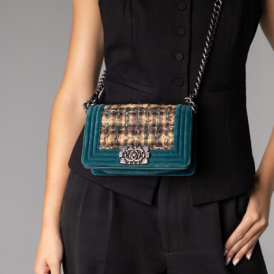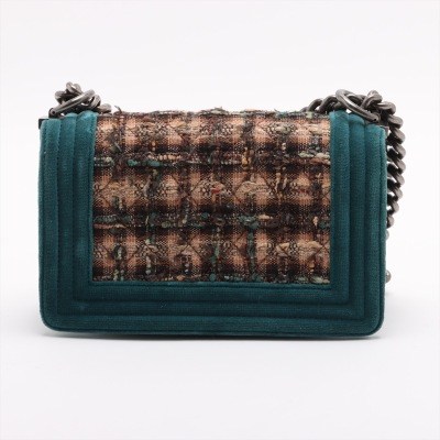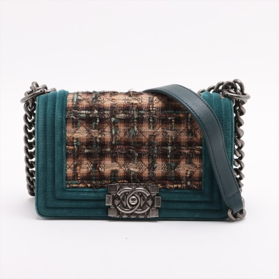 Chanel small boy flap bag in tweed-quilted green and beige textile with a velvet green linear quilted border (#18xxxxxx, circa: 2013 - 2014). Featuring aged silver-toned hardware, and a frontal flap with Chanel boy logo press-lock closure. It opens to a navy blue textile interior with a patch pocket. Approximate dimensions: 20cm(L) x 12cm(H) x 6.5cm(D), and a 55cm shoulder strap drop. With Entrupy Certificate of Authenticity. (Pre-owned)