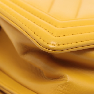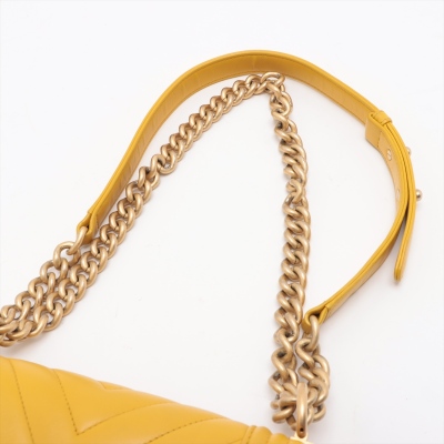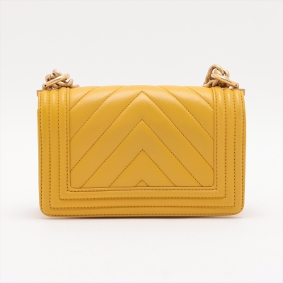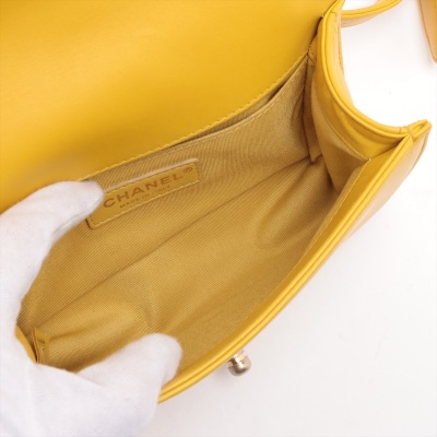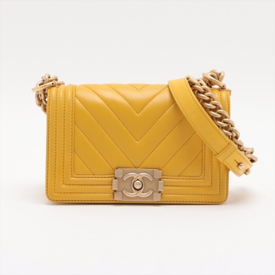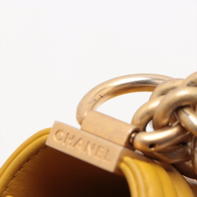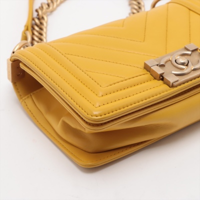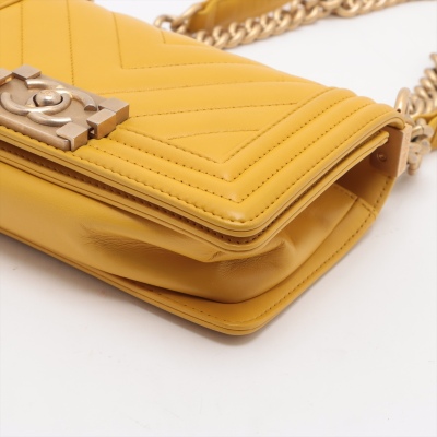 Chanel small Boy flap bag in chevron-quilted mustard yellow leather with a linear quilted border (#24xxxxxx, circa: 2017 - 2018). Featuring aged gold-toned hardware, and a front flap with Chanel boy logo press-lock closure. This opens to a yellow textile interior with a patch pocket. Approximate dimensions: 20cm(L) x 13cm(H) x 7cm(D), and a 54cm chain strap drop. With Entrupy Certificate of Authenticity.