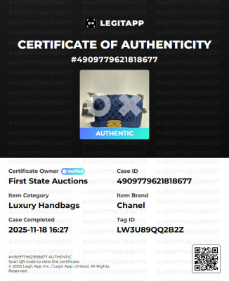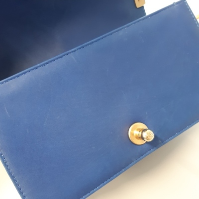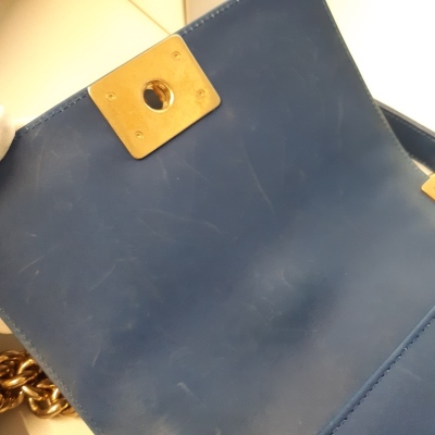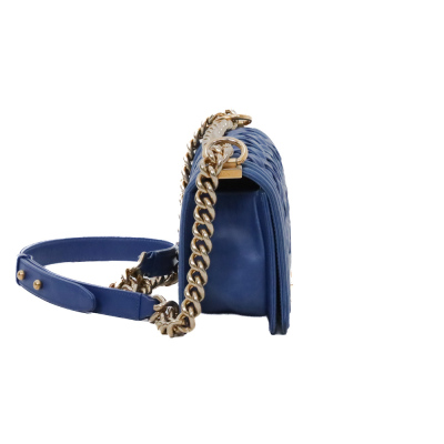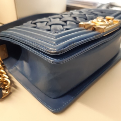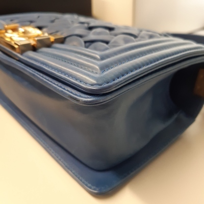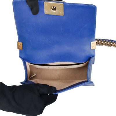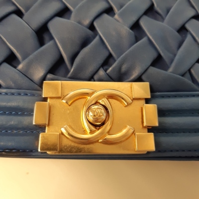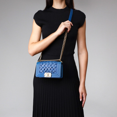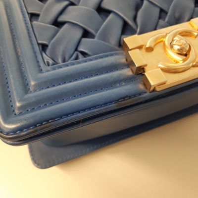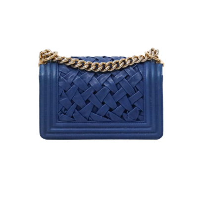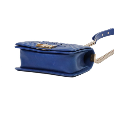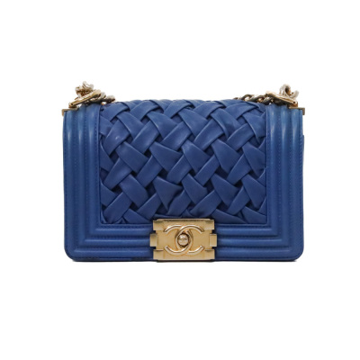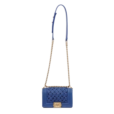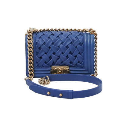 Chanel small Chateau Boy flap bag in blue woven lambskin leather with a linear-quilted border (#17xxxxxx, Circa: 2012). Featuring antique gold-toned hardware, and a sliding chain shoulder strap with adjustable leather shoulder pad. The front flap with Chanel boy logo press-lock closure opens to a beige textile-lined interior with a patch pocket. Approximate dimensions: 20cm(L) x 12cm(H) x 5cm(D), and 54cm shoulder strap drop. Accompanied by a Chanel certificate card, dustbag and box. With LegitApp Certificate of Authenticity. (Pre-owned).