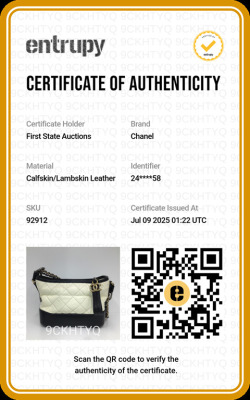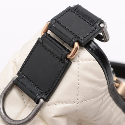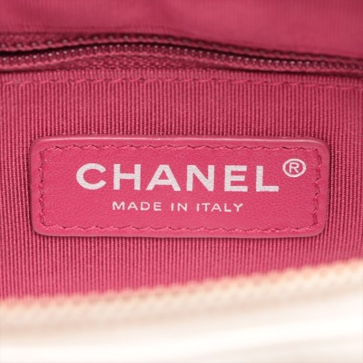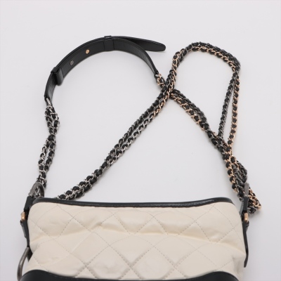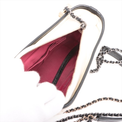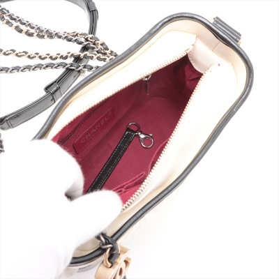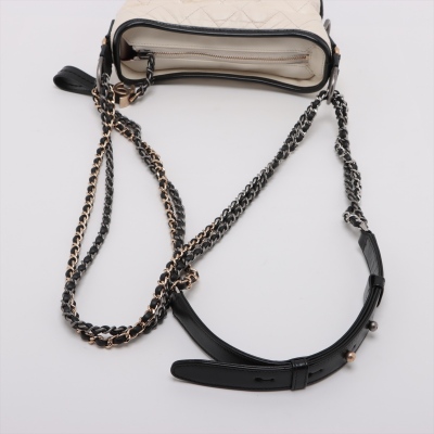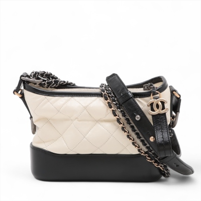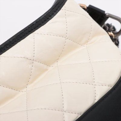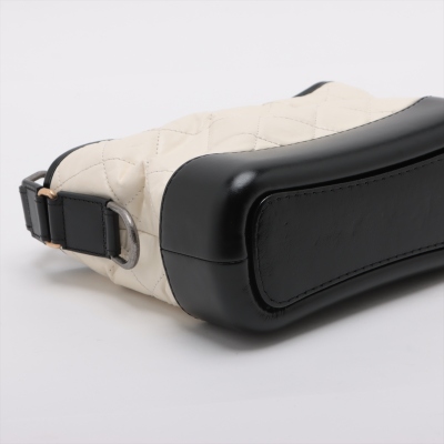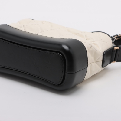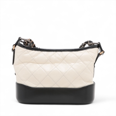 Chanel small Gabrielle hobo bag in white diamond-quilted aged calfskin with black top leather trim and smooth black leather base(#24xxxxxx). Featuring three-tone hardware, and sliding chain link-leather threaded shoulder strap. The zip top opens to a red textile interior with a patch and zip pocket. Approximate dimensions: 21cm(Top-L) x 16cm(H) x 9cm(D), max. strap drop 76cm. Accompanied by Chanel card & dustbag. With Entrupy Certificate of Authenticity. (Pre-owned)
