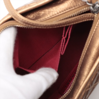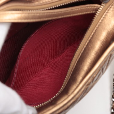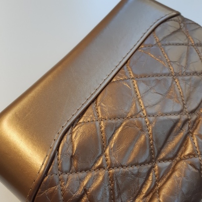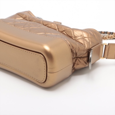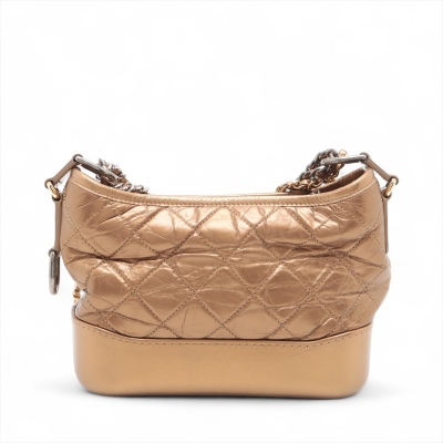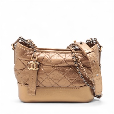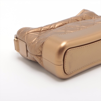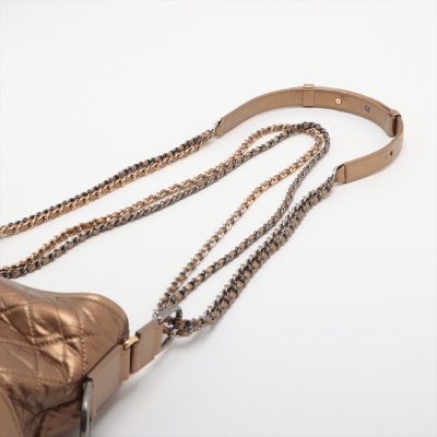 Chanel small Gabrielle hobo bag in golden diamond-quilted aged calfskin with top leather trim and smooth golden leather base(#23xxxxxx). Featuring three-tone hardware, and sliding chain link-leather threaded shoulder strap. The zip top opens to a red textile interior with a patch and zip pocket. Approximate dimensions: 21cm(Top-L) x 16cm(H) x 9cm(D), max. strap drop 76cm. With Entrupy Certificate of Authenticity. (Pre-owned)