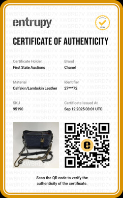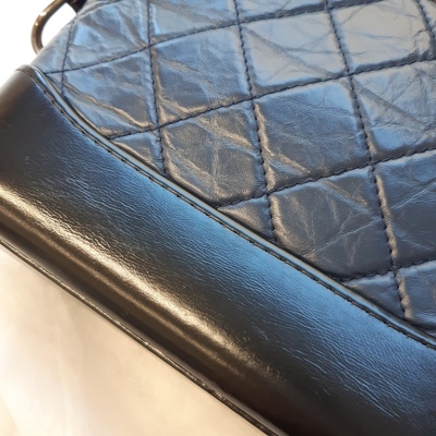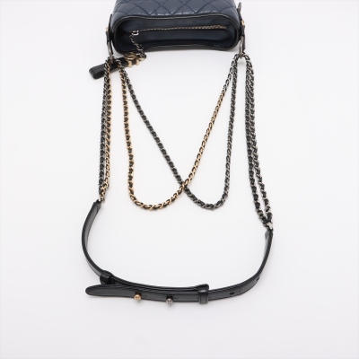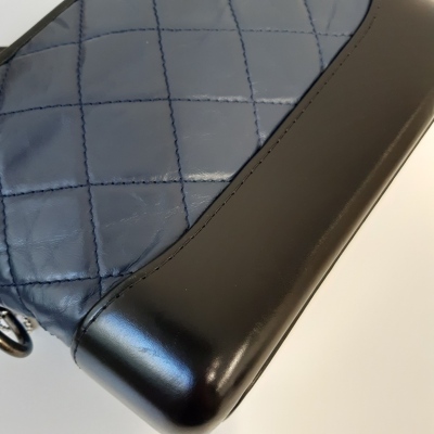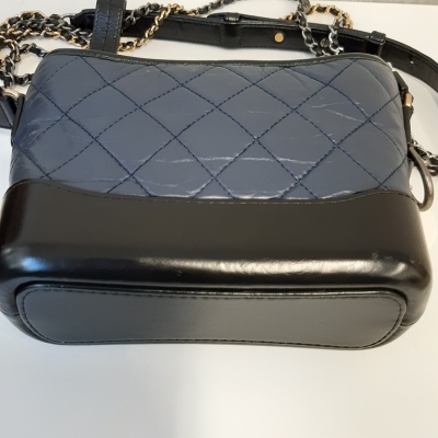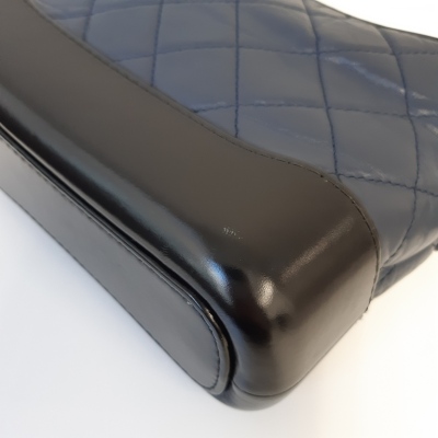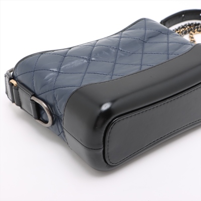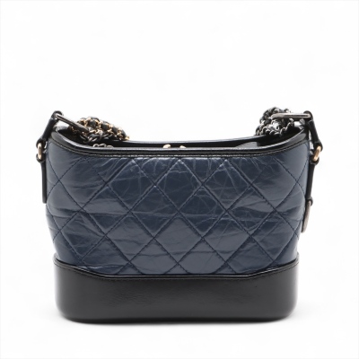Chanel small Gabrielle hobo bag in navy diamond-quilted aged calfskin with black top leather trim and smooth black leather base(#27xxxxxx). Featuring three-tone hardware, and sliding chain link-leather threaded shoulder strap. The zip top opens to a red textile interior with a patch and zip pocket. Approximate dimensions: 21cm(Top-L) x 16cm(H) x 9cm(D), max. strap drop 76cm. Accompanied by Chanel card. With Entrupy Certificate of Authenticity. (Pre-owned)