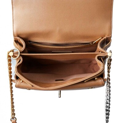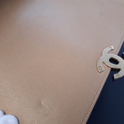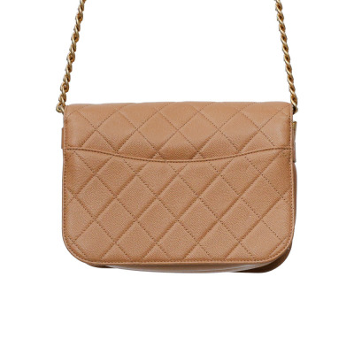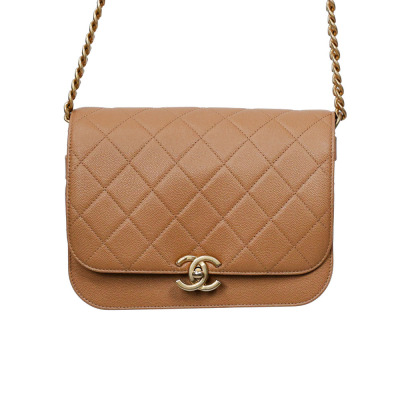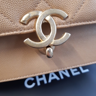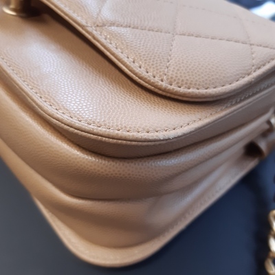 Chanel small messenger bag in beige Caviar leather (#LGxxxxxx). Featuring antique gold tone hardware, exterior rear flat pocket. The front flap with CC turn lock closure opens to a inner flap pocket, and the textile lined interior with 2 main compartments with a zipper pocket. Approx dimensions: 22.5cm(L) x 15cm(H) x 10m(D), 52cm leather-chain shoulder strap with cc buckle & adjustable. Accompanied by copy of Chanel purchase record, info booklet, dustbag & box. (Pre-owned)