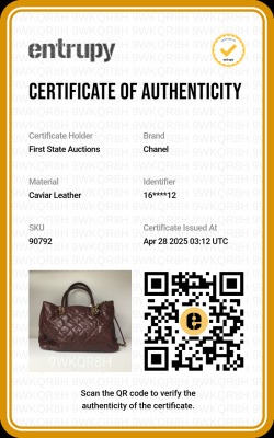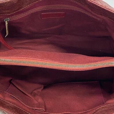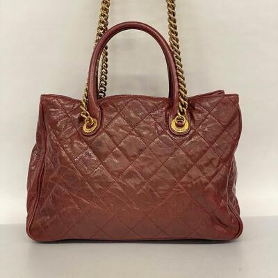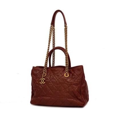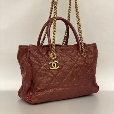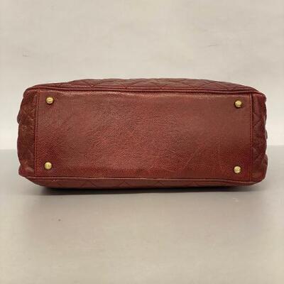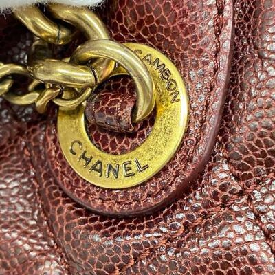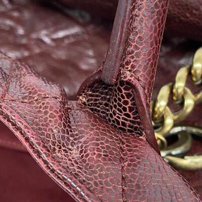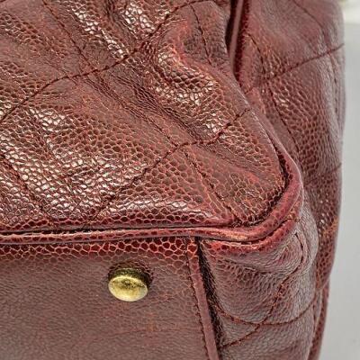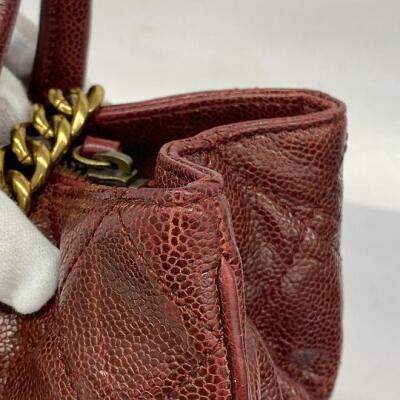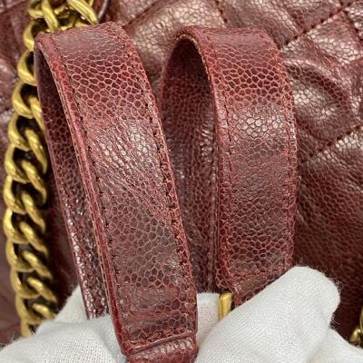Chanel small Shiva tote in Bordeaux quilted aged Caviar skin (#16xxxxxx). Featuring antique gold-tone hardware, dual rolled top handles with interlocking CC pendant and chain-link & leather shoulder straps. The open top reveals to maroon fabric interior with 2 compartments separated by a zipper pocket. Approx dimensions: 30cm(L) x 22cm(H) x 12m(D), 12cm handle drop & 32cm shoulder drop. Accompanied by Chanel dustbag. With Entrupy Certificate of Authenticity. (Pre-owned)