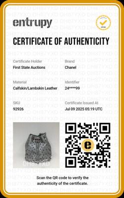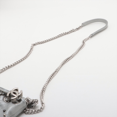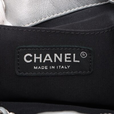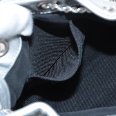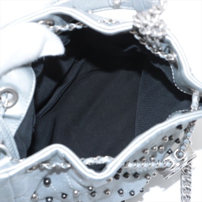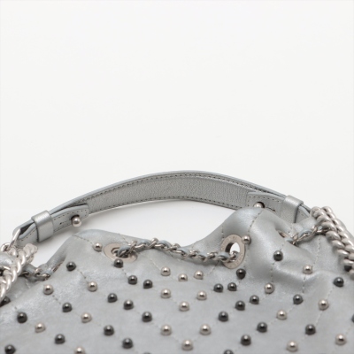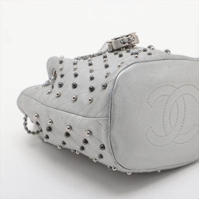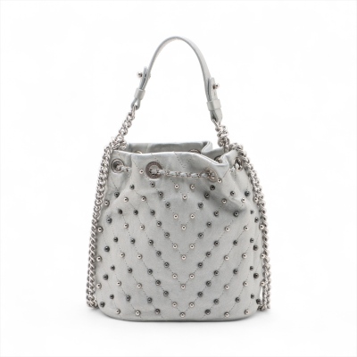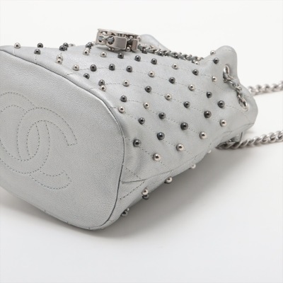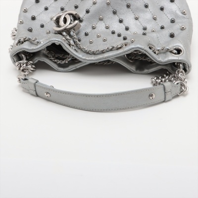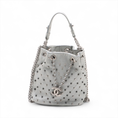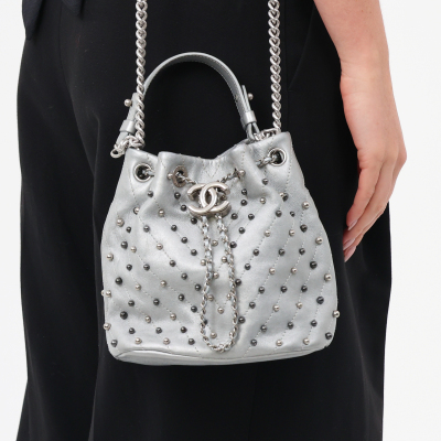 Chanel Stud Wars bucket bag in silver chevron-quilted calfskin leather (24xxxxxx). Featuring matt silver-toned hardware, two-tone hardware studs along stitching, and single flat top handle. The leather-chain cinch cord with CC logo opens to a black textile interior with a patch pocket. Approx dimensions: 17cm(L) x 18cm(H) x 12cm(D), handle drop 12cm, chain shoulder strap 61cm. Accompanied by Chanel authentication card. With Entrupy Certificate of Authenticity. (Pre-owned)