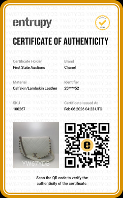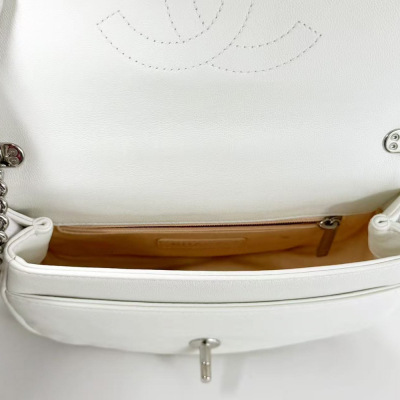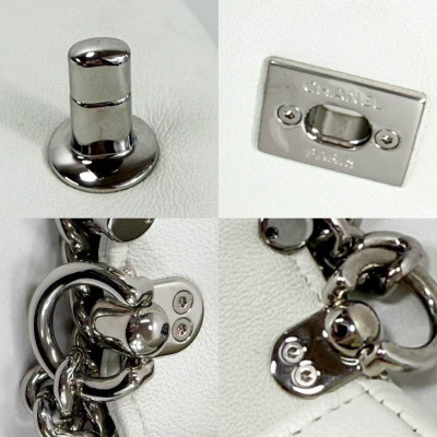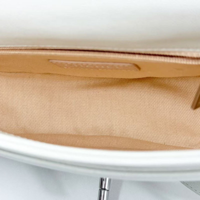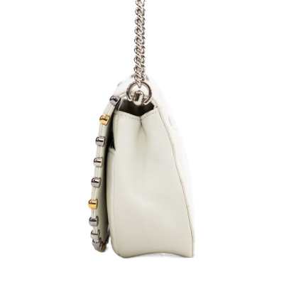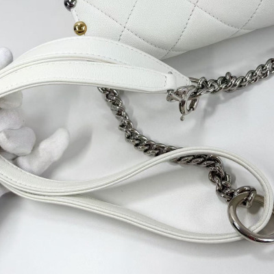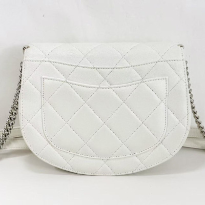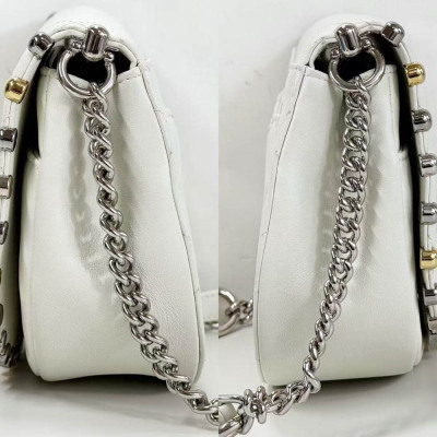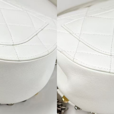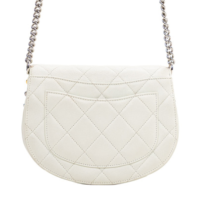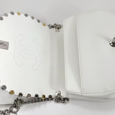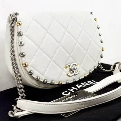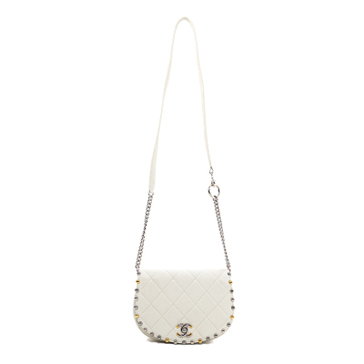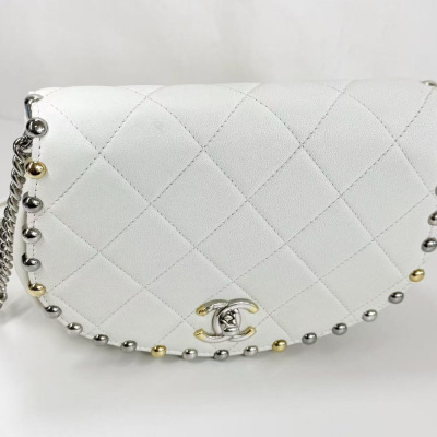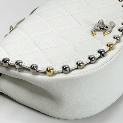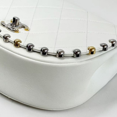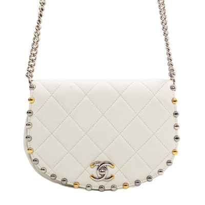 Chanel studded bubble flap bag in white diamond-quilted leather (#25xxxxxx, circa: 2018). Featuring a round shape, gold and silver studs along trim of flap, exterior rear pocket, and chain strap with leather pad. The CC turn-lock closure on flap opens to a patch pocket and textile interior with a zipper pocket. Approx dimensions: 24cm(L) x 18cm(H) x 8cm(D), with a 58cm strap drop. Accompanied by a Chanel authenticity card, dustbag and box. With Entrupy Certificate of Authenticity.