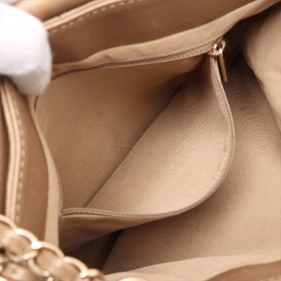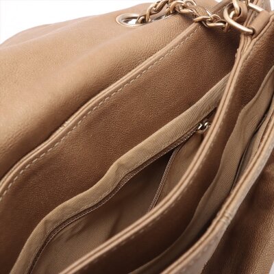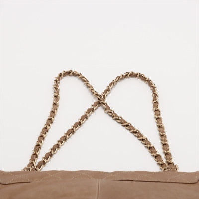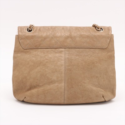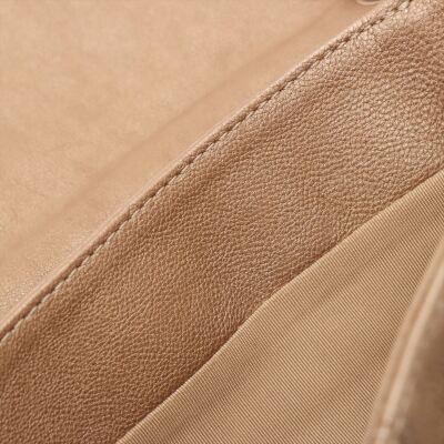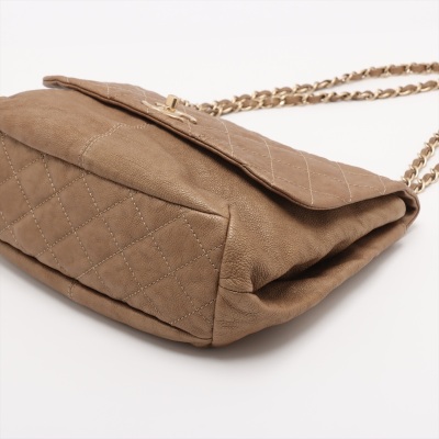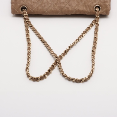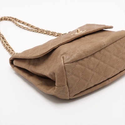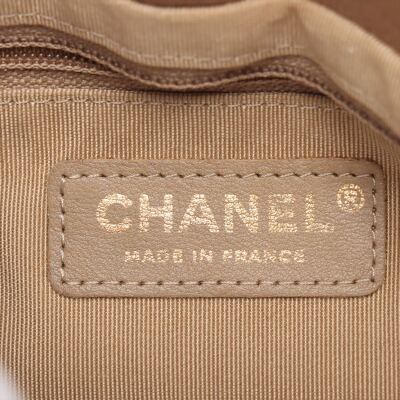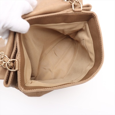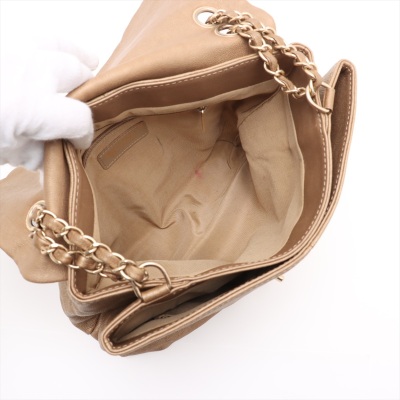 Chanel Trianon Messenger bag in distressed gold calfskin leather (#17xxxxxx, circa: mid2012-2013). Featuring matte gold-toned hardware and sliding leather-chain woven shoulder strap. The CC turn-lock closure on flap opens to two beige textile-lined compartments, one with a zippered pocket and the other with two patch pockets. Approx dimensions: 24cm(L) x 22cm(H) x 9cm(D), 27cm double loop strap drop. Accompanied by a Chanel authenticity card. With Entrupy Certificate of Authenticity.
