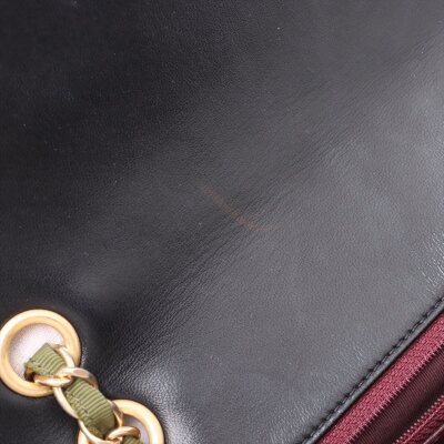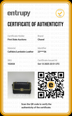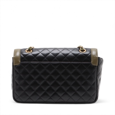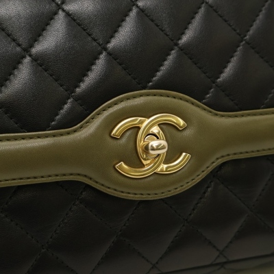 Chanel Two-Tone flap bag in diamond-quilted black and khaki lambskin leather (#23xxxxxx, circa: 2016-17). Featuring gold-tone hardware, exterior rear patch pocket, and chain-fabric sliding shoulder strap. The front flap with CC turn-lock closure opens to a Maroon leather interior with zipper & patch pockets. Approximate dimensions: 27cm(W) x 17cm(H) x 6cm(D), 28cm doubled strap drop . Accompanied by Chanel info booklet, authenticity card, cleaning mitt and dustbag. With Entrupy Certificate of Authenticity.