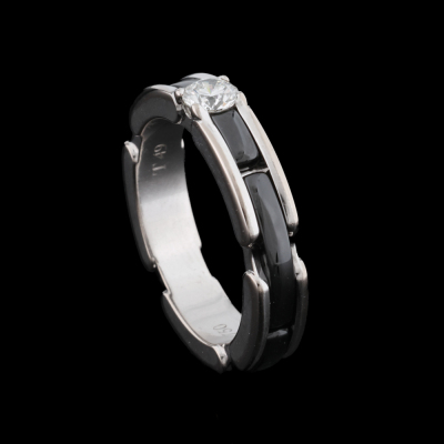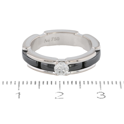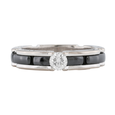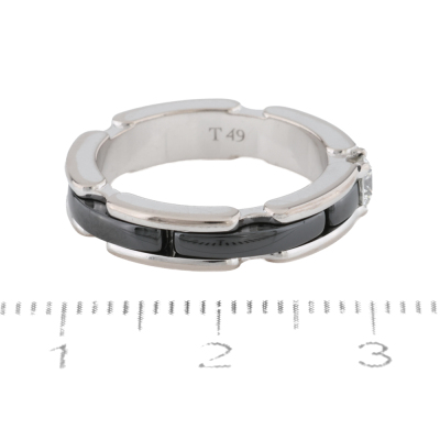 Chanel Ultra ring, small version with a round Diamond of approximately 0.20ct. 18ct white gold and black ceramic. Note minor wear marks on metal. Chanel stamped size T49, I 1/2 - ring resizing is not recommended. Band width: 4mm. Weight: 5.6g. With Chanel box.