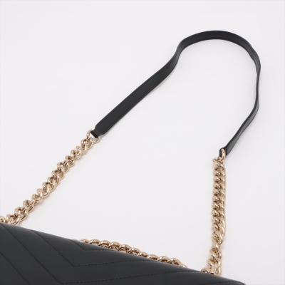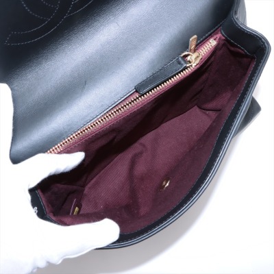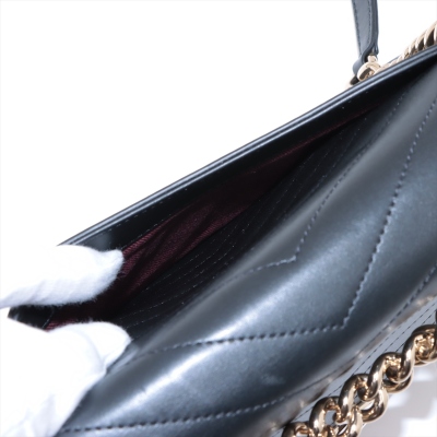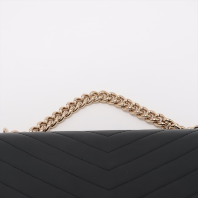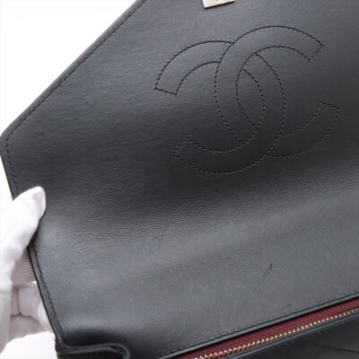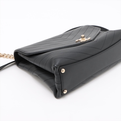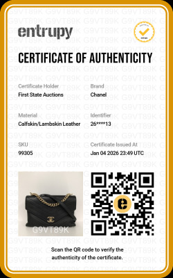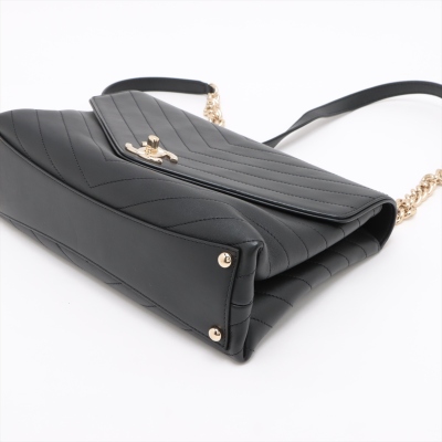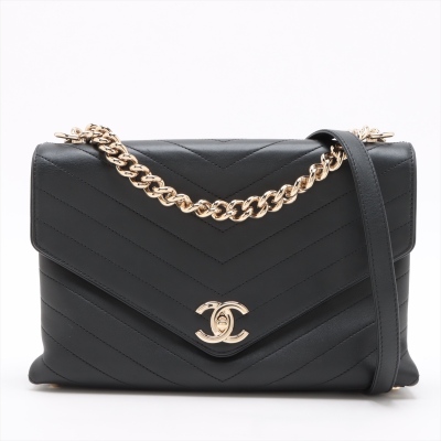 Chanel Envelope flap bag in black chevron-quilted calfskin leather (#26xxxxxx, circa: 2018-2019). Featuring light gold-toned hardware, a chain top handle, slip pocket at back and a chain-leather shoulder strap. The classic CC turn-lock closure opens to a burgundy textile-lined interior with two compartments divided by a centre zipper pocket. Approximate dimensions: 28.5cm(L) x 17.5cm(H) x 8.5cm(D), 8,5cm handle drop, and 55.5cm shoulder strap drop. Accompanied by a Chanel authenticity card. With Entrupy Certificate of Authenticity. (Pre-owned)