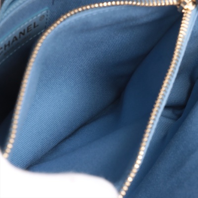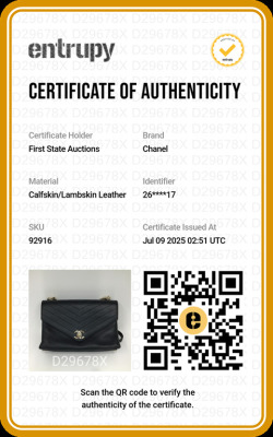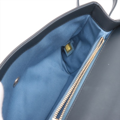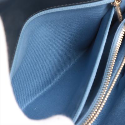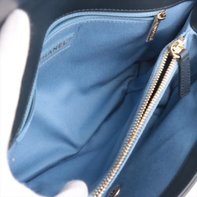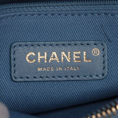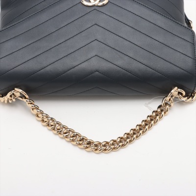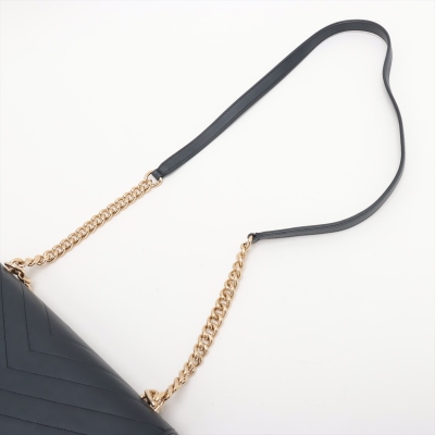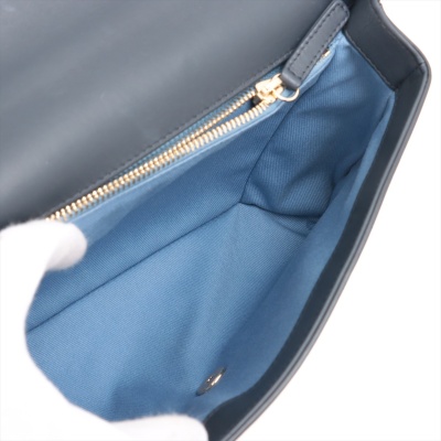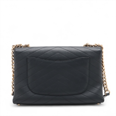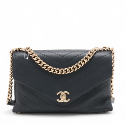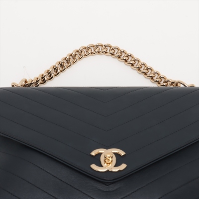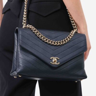 Chanel chevron stitched envelope flap bag in dark navy blue smooth lambskin leather (#26xxxxxx). Featuring shiny gold-toned hardware, a rear patch pocket and a chain handle. CC turn-lock on envelope-style flap opens to a blue textile lining interior with zipper and flat pockets. Approximate dimensions: 28cm(Base-L) x 18.5cm(H) x 8.5m(D), 9cm handle drop and 54cm leather-chain strap. With Entrupy Certificate of Authenticity. (Pre-owned)