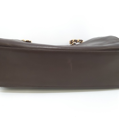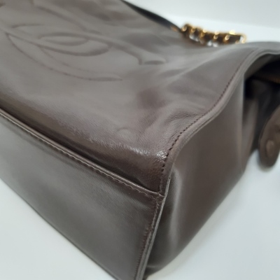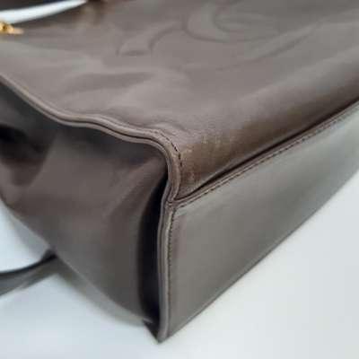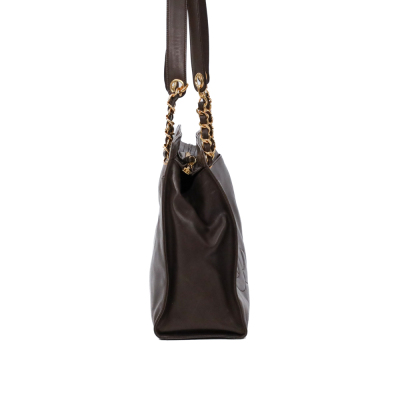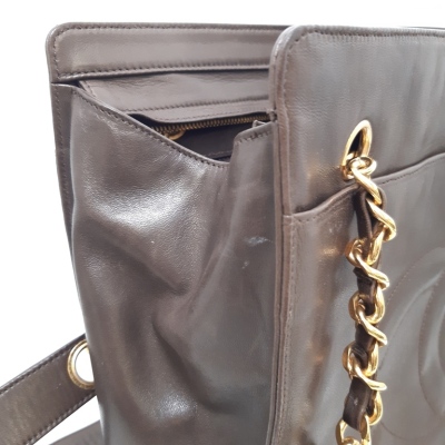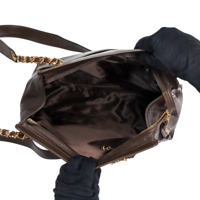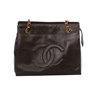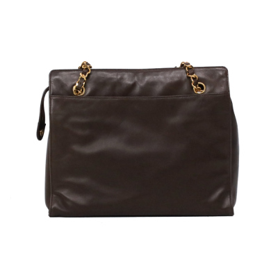 Chanel vintage CC logo tote bag in brown smooth lambskin (#3xxxxxx, circa: 1994-1996). Featuring gold-toned hardware, dual chain-leather shoulder straps, a stitched CC logo on the front, and slip pockets on the front & back. The top zip closure opens to a brown nylon interior with two zip pockets. Approximate dimensions: 30cm(L) x 25cm(H) x 11cm(D) and 36cm shoulder strap drop. Accompanied by a Chanel authentication card, dustbag and box. With Entrupy Certificate of Authenticity. (Pre-owned).