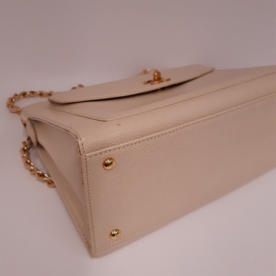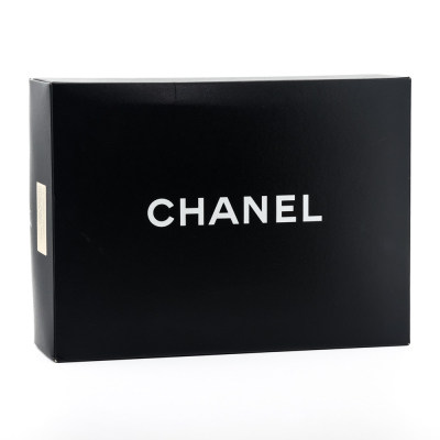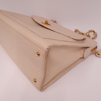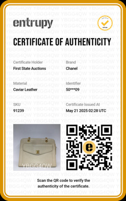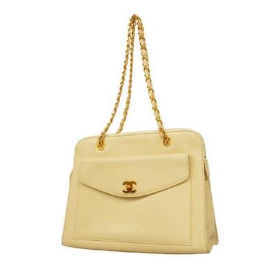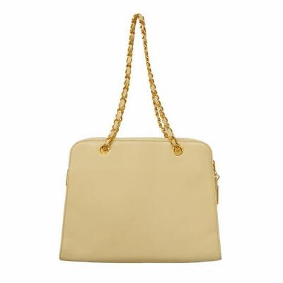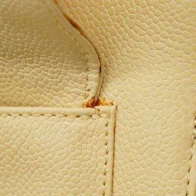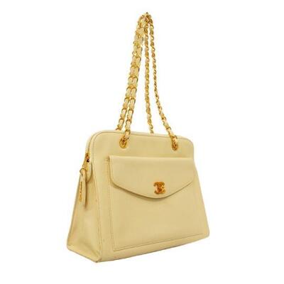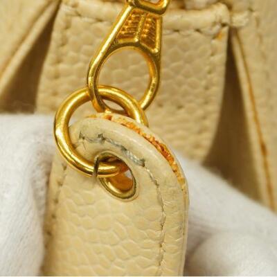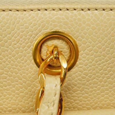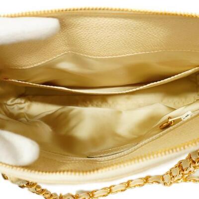 Chanel Vintage flap shoulder bag in ivory caviar leather (#5xxxxxx). Featuring gold-toned hardware, front flap pocket with CC turn-lock closure, and leather-chain handles. The zip top opens to a beige interior with a patch and zip pocket. Approximate dimensions: 30cm(Base-L) x 21cm(H) x 11cm(D), shoulder drop 29cm. Accompanied by Chanel box. With Entrupy Certificate of Authenticity. (Pre-owned)