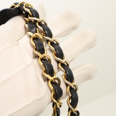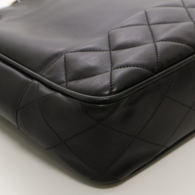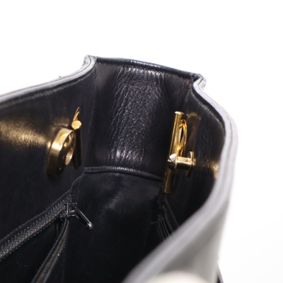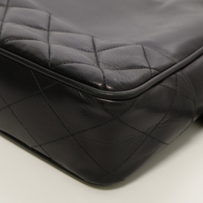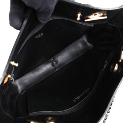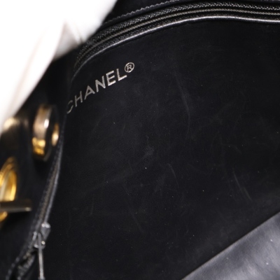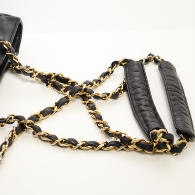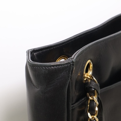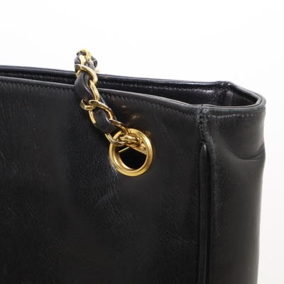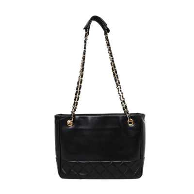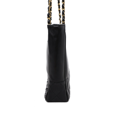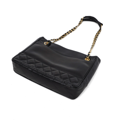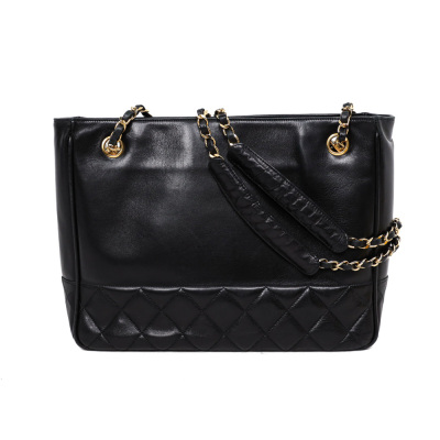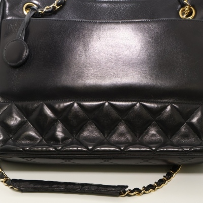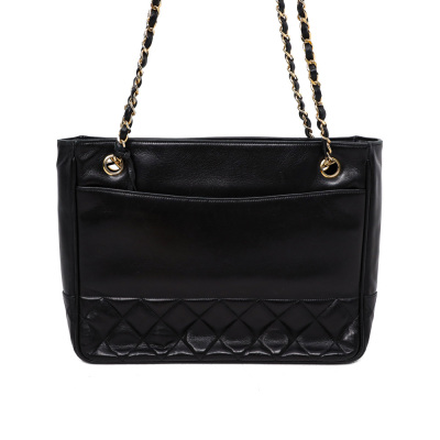 Chanel vintage tote bag in black smooth & diamond quilted lambskin. Featuring gold tone hardware, a patch pocket at front, dual leather woven with leather padding shoulder straps. The top with dual insert buttons reveals to a leather lining interior with dual hanging zipping pockets. Approximate dimensions: 29cm(L) x 22cm(H) x 6m(D), 32cm shoulder drop. With Entrupy Certificate of Authenticity.