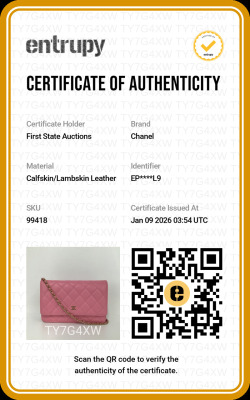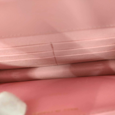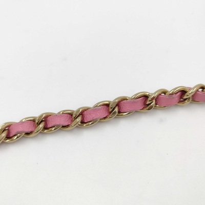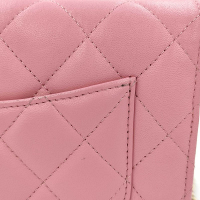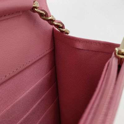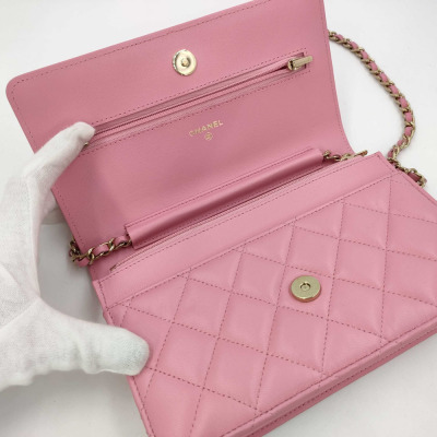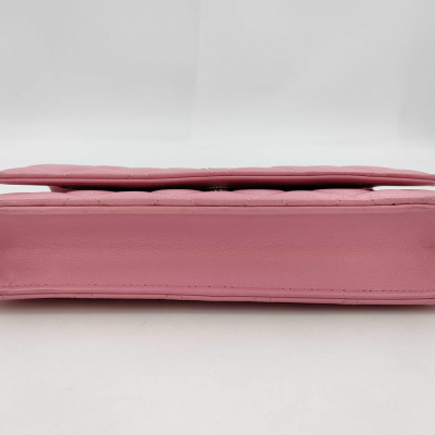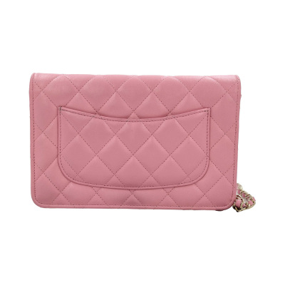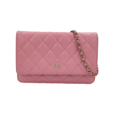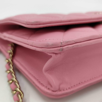Chanel Wallet on Chain in pink diamond quilted lambskin leather (#Epxxxxxx). Featuring light gold-toned hardware, pink leather threaded crossbody strap, a front flap with a CC logo, an exterior slip pocket, and opens to an interior of matching fabric with card slots, a patch pocket, and a zippered compartment. Approx dimensions: 19.5cm(L) x 13cm(H) x 3.5cm(D), and 59cm shoulder drop. With Entrupy Certificate of Authenticity. (Pre-owned)