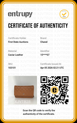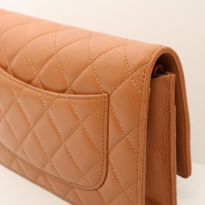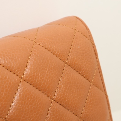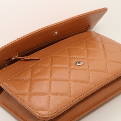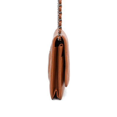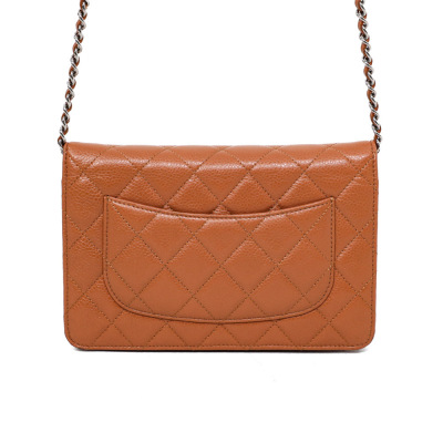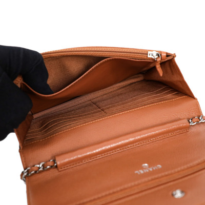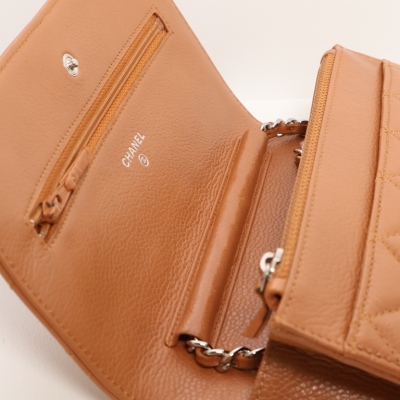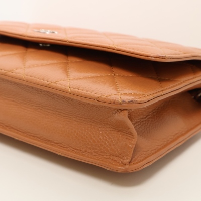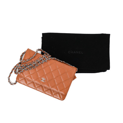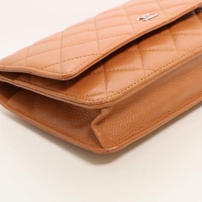 Chanel Wallet on Chain in light brown diamond-quilted caviarskin leather (#15XXXXXX, circa: 2011-2012). Featuring silver-toned hardware, a rear exterior pocket, sliding chain with leather link strap and CC logo at front flap. The magnetic button closure opens to a matching textile interior with a front patch pocket, a zippered pocket and a main compartment with card slots and patch pocket. Approximate dimensions: 19cm(W) x 13cm(H) x 4cm(D), and a 62cm chain strap drop. Accompanied by a Chanel dustbag. With Entrupy Certificate of Authenticity.