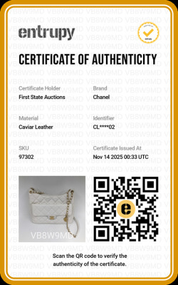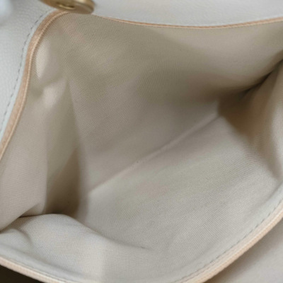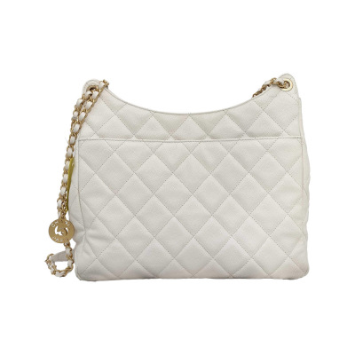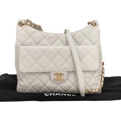 Chanel Wavy CC hobo bag in white diamond quilted Caviar skin (CLxxxxxx). Featuring aged gold-tone hardware, chain link with a logo detailed plate and leather pad shoulder strap, exterior pockets at front and back. The top magnetic button closure opens to a beige fabric interior with zipper and patch pockets. Approx. dimensions: 30cm(W) x 21.5cm(H) x 7cm(D), and 48cm shoulder height. Accompanied by Chanel dustbag. With Entrupy Certificate of Authenticity. (Pre-owned)