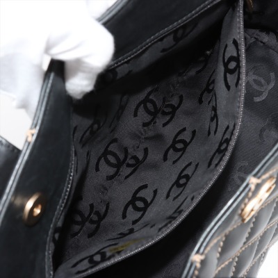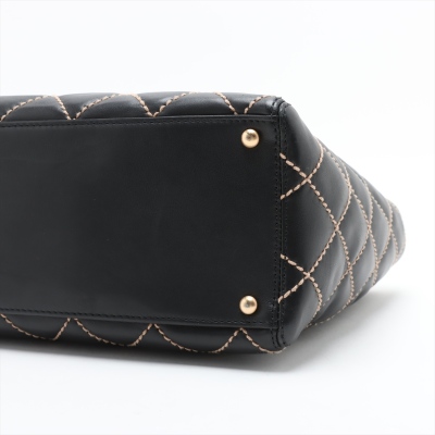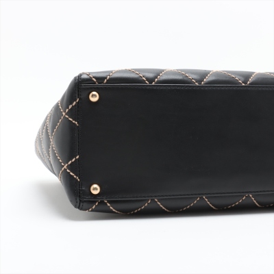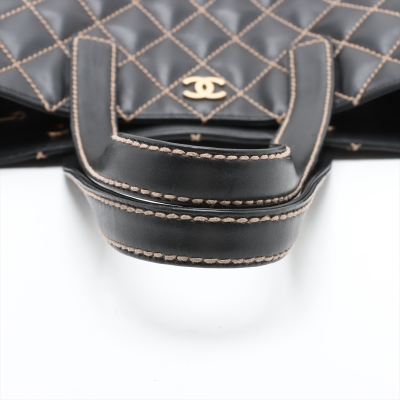 Chanel wild stitch suprique tote bag in black diamond-quilted calfskin leather (#8xxxxxx). Featuring gold-toned hardware, contrasting beige thick stitching, and dual flat top handles. The dual magnetic buttons open to a black logo-embossed fabric lining interior with dual zipper pockets. Approximate dimensions: 35cm(L) x 23cm(H) x 13cm(D), handle drop 20cm. With Entrupy Certificate of Authenticity. (Pre-owned)