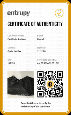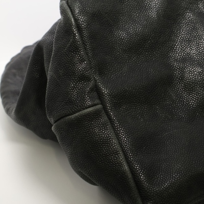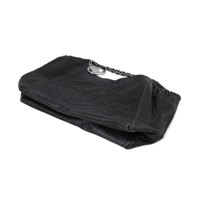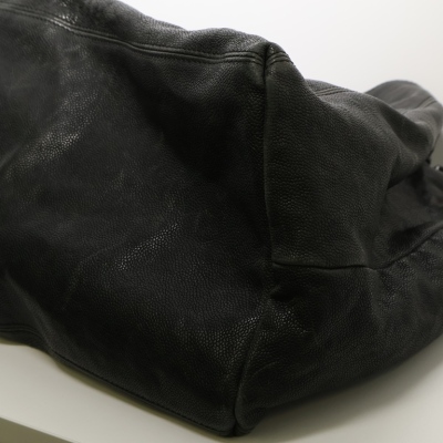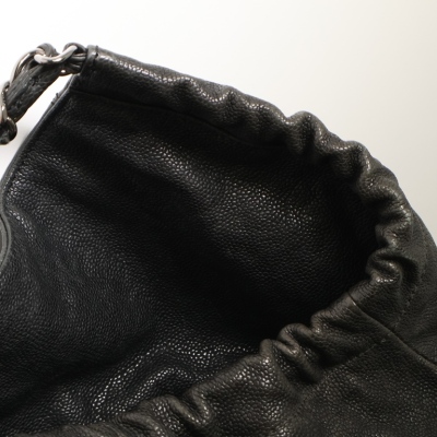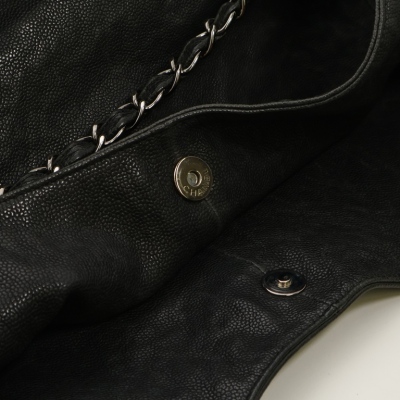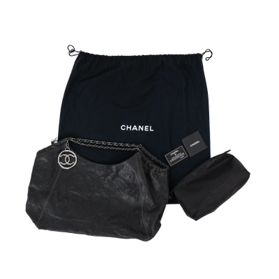 Chanel Coco XL Cabas hobo in black distressed caviar leather (#11xxxxxx, 2006-2008). Featuring shiny dark silver-toned hardware, a prominent Chanel CC stitched on the front, leather-threaded silver chain link shoulder straps, and a CC logo medallion. The top with a magnetic button opens to a black Chanel logo jacquard nylon interior with zipper & patch pockets and a removable pouch. Approximate dimensions: 43cm(B-L) x 29cm(H) x 20m(D), 13cm shoulder drop. Accompanied by Chanel certificate card and dust bag. With Entrupy Certificate of Authenticity.