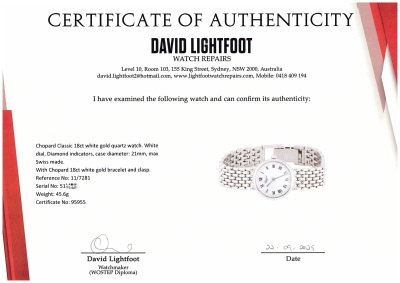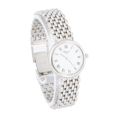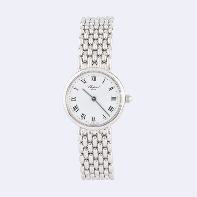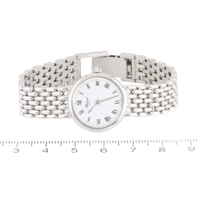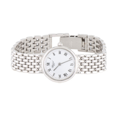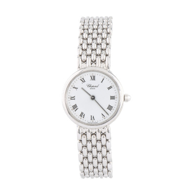 Chopard Classic 18ct white gold quartz ladies watch. White dial, Diamond indicators, case diameter: 21mm, max wrist size: 15.5cm, Swiss made. Ref# 11/7281. With Chopard 18ct white gold bracelet and clasp. With Certificate of Authenticity. 3 month FSA warranty. Weight: 45.6g (Pre-owned)