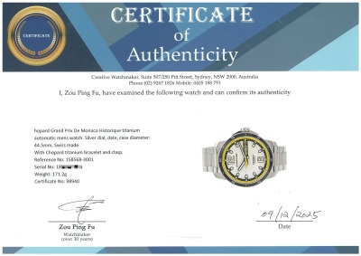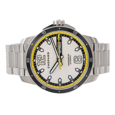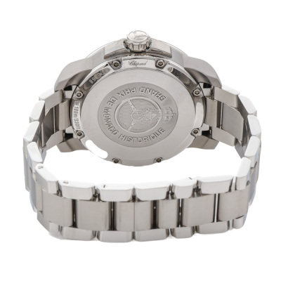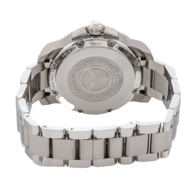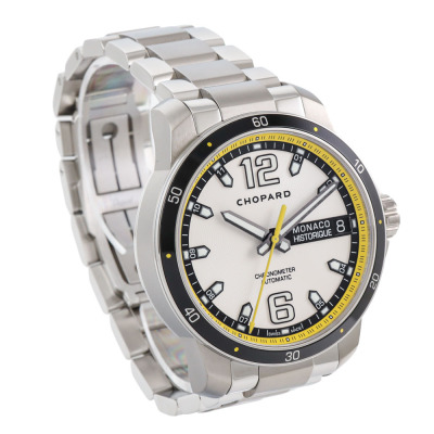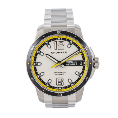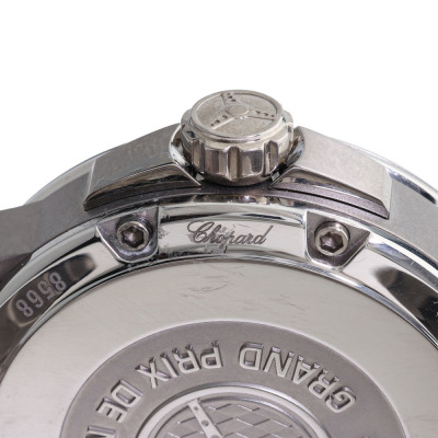 Chopard Grand Prix De Monaco Historique titanium automatic mens watch. Silver dial, date, case diameter: 44.5mm, wrist size: 19cm, Swiss made. Ref# 158568-3001. With Chopard titanium bracelet and clasp. With Certificate of Authenticity, Chopard Certificate of Origin dated 26/01/2020 and Chopard box. 3 month FSA warranty. Weight: 171.2g (Pre-owned)
