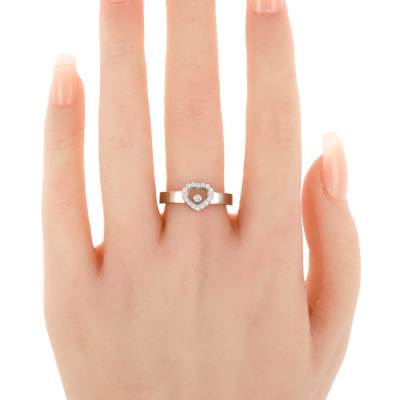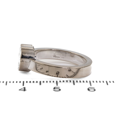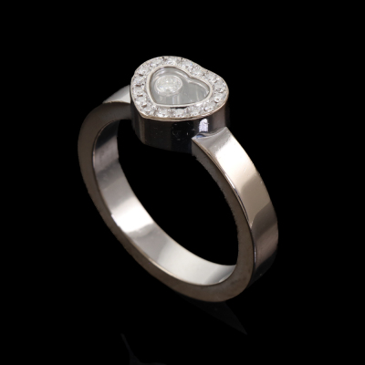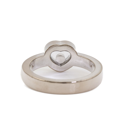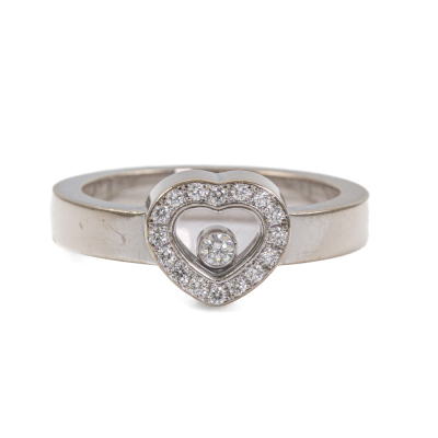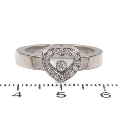 Chopard Happy Diamond Icons Heart ring with one floating natural round Diamond and surrounding 16 round Natural Diamonds totalling approximately 0.12ct. 18ct white gold. Ring size: N - ring resizing is not recommended. Band width: 3.5mm. Weight: 8.6g. (Pre-owned)