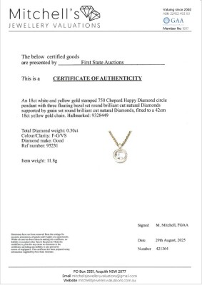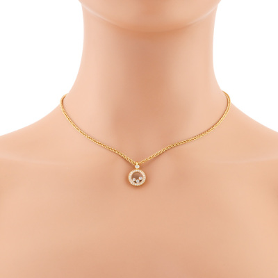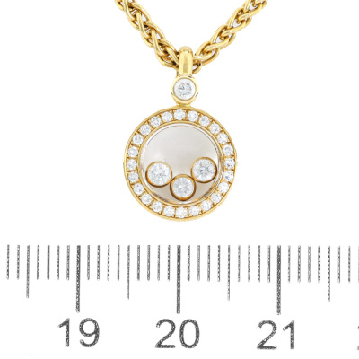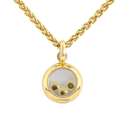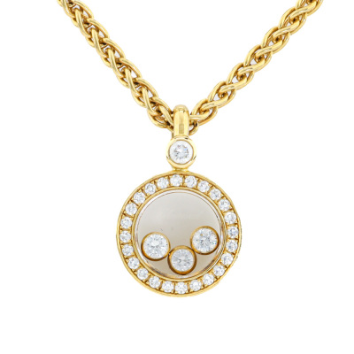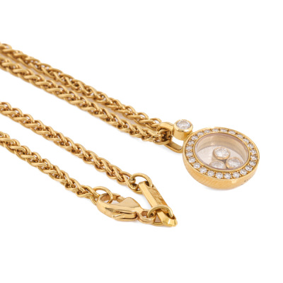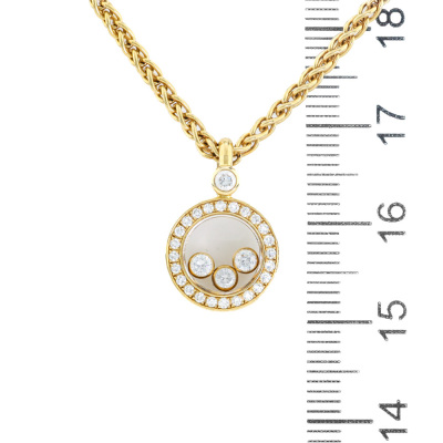 Chopard Happy Diamond pendant with round Natural Diamonds (including 3 floating Diamonds) totalling approximately 0.30ct (Estimated grading: F-G VS). 18ct yellow gold with Chopard 42cm 18ct yellow gold chain. Weight: 11.8g. With Certificate #421364. (Pre-owned)
