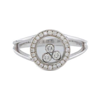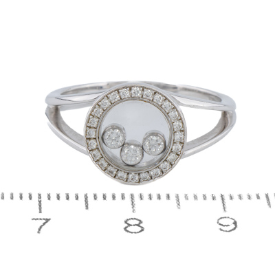 Chopard Happy Diamond ring with round Natural Diamonds (including 3 floating Diamonds) totalling approximately 0.25ct. 18ct white gold. Ring size: P 1/2 - ring resizing is not recommended. Band width: 2.2mm. Weight: 6.4g. With Chopard box. (Pre-owned)