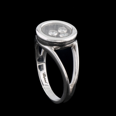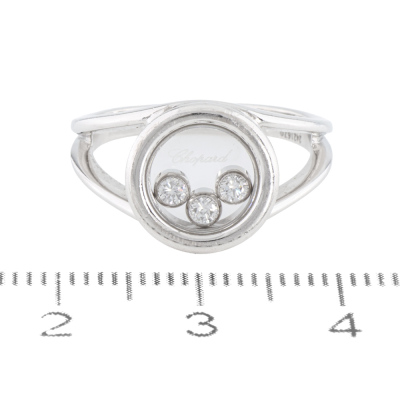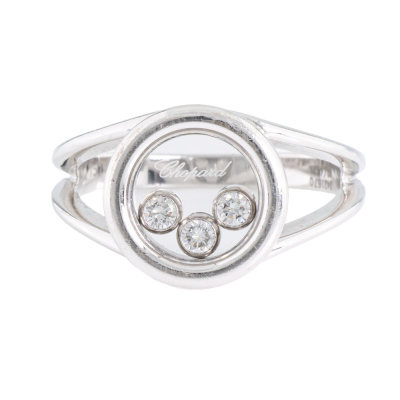 Chopard Happy Diamond ring with 3 floating round Natural Diamonds totalling approximately 0.12ct. 18ct white gold. Ring size: K - ring resizing is not recommended. Band width: 2.2mm. Weight: 5.8g. (Pre-owned)