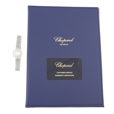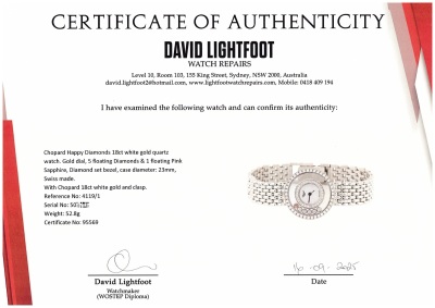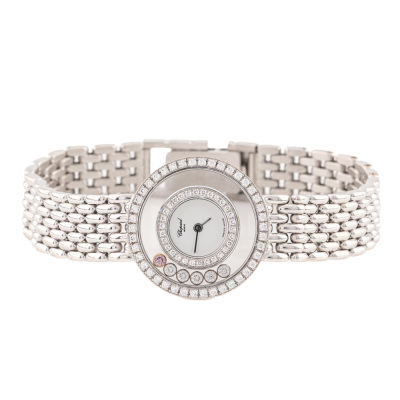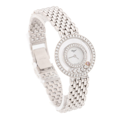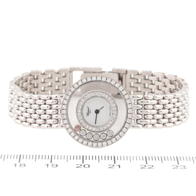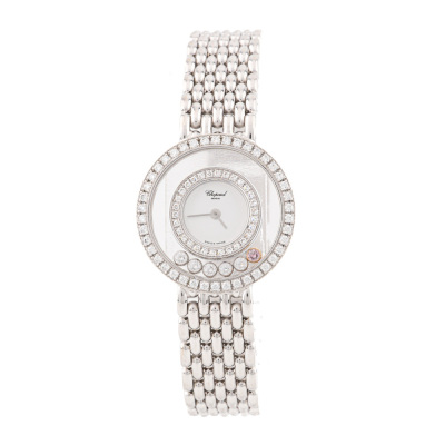 Chopard Happy Diamonds 18ct white gold quartz ladies watch. Gold dial, 5 floating Diamonds & 1 floating Pink Sapphire, Diamond set bezel, case diameter: 23mm, wrist size: 16.5cm, Swiss made. Ref# 4119/1. With Chopard 18ct white gold and clasp. With Certificate of Authenticity, Chopard Certificate of Origin & Authenticity, Chopard Warranty Certificate card dated 19/08/2008 and Chopard box. 3 month FSA warranty. Weight: 52.8g (Pre-owned)