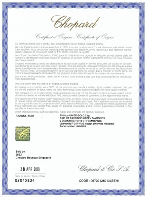 Chopard Happy Diamonds Icons earrings with 2 floating round Natural Diamonds totalling 0.10ct. 18ct white gold with 18ct white gold secured backs. Made in Germany. Weight: 5.3g. With Chopard inner and outer Box. With Chopard Origin Certificate & Chopard Invoice dated: 28/04/2019 (Pre-owned)
