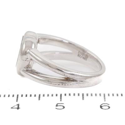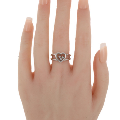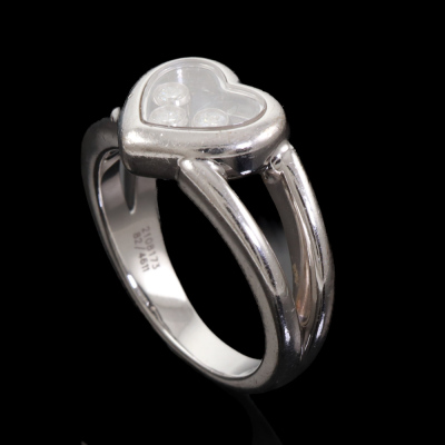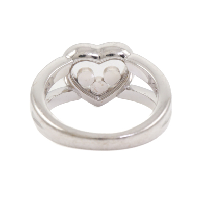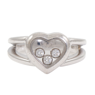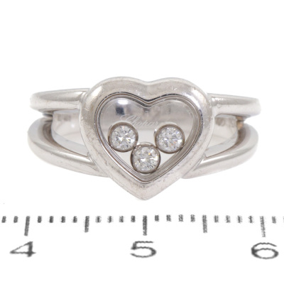 Chopard Happy Diamonds heart shape ring with 3 floating round Natural Diamonds totalling 0.15ct (Estimated grading: F-G VS). 18ct white gold. Ring size K - ring resizing is not recommended. Band width: 2.8mm - 7.3mm. Weight: 8.6g. (Pre-owned)