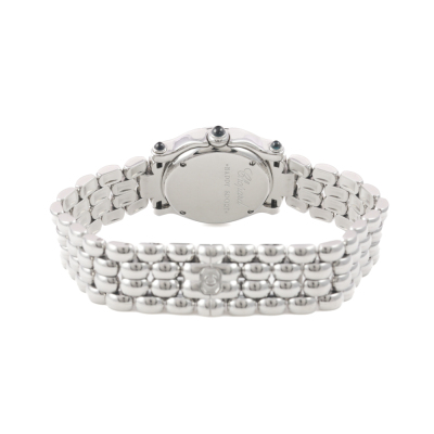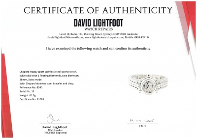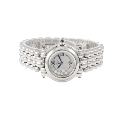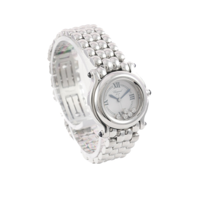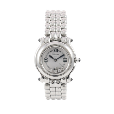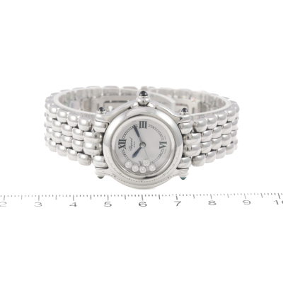 Chopard Happy Sport stainless steel quartz ladies watch. White dial with 5 floating Diamonds, case diameter: 26mm, wrist size: 16.5cm, Swiss made. Ref# 8245. With Chopard stainless steel bracelet and clasp. With Certificate of Authenticity. 3 month FSA warranty. (Pre-owned)