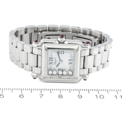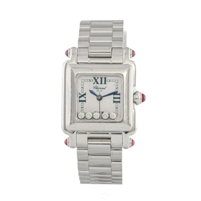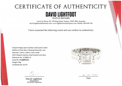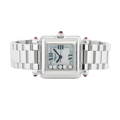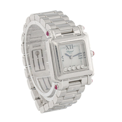 Chopard Happy Sport stainless steel quartz ladies watch. Mother of Pearl dial, 5 floating Diamonds, case diameter: 23mm x 20mm, wrist size: 13.5cm, Swiss made. Ref# 27/8893-21. With Chopard stainless steel bracelet and clasp. With Certificate of Authenticity. 3 month FSA warranty (Pre-owned)
