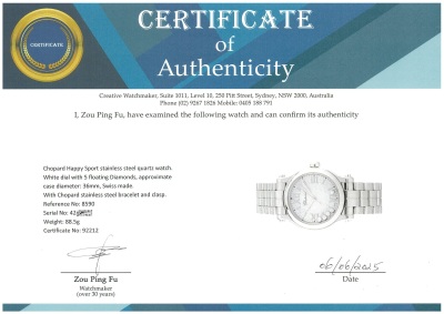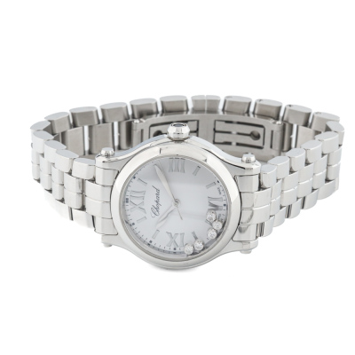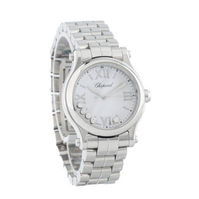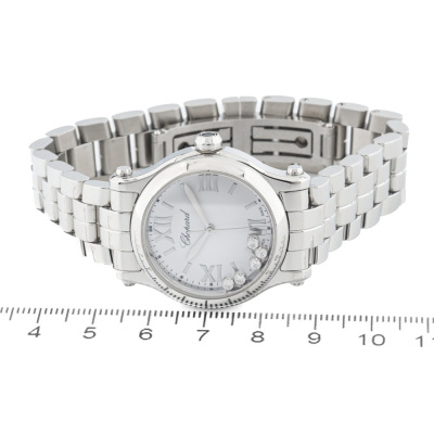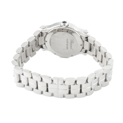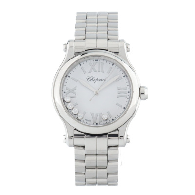Chopard Happy Sport stainless steel quartz watch. White dial with 5 floating Diamonds, approximate case diameter: 36mm, wrist size: 17cm, Swiss made. Ref# 8590. With Chopard stainless steel bracelet and clasp. With Certificate of Authenticity and Chopard box. 3 month FSA warranty. (Pre-owned)