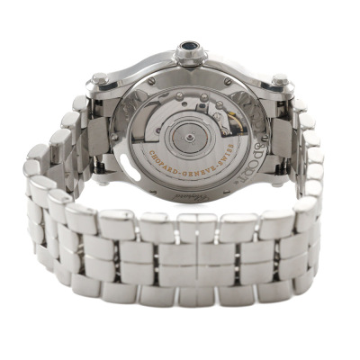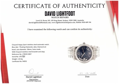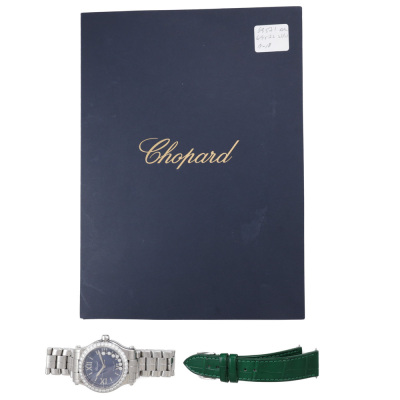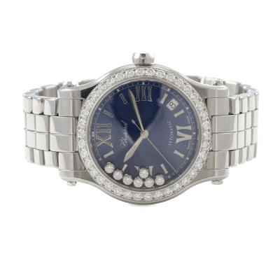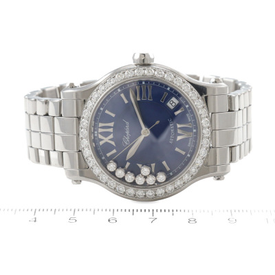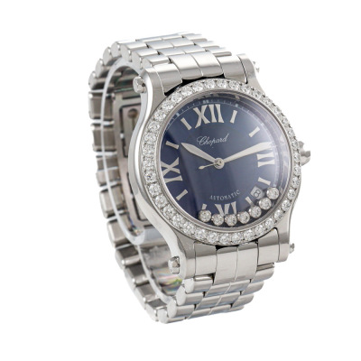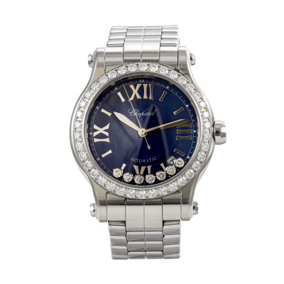 Chopard Happy Sport stainless steel automatic watch. Blue dial, 7 floating Diamonds, date, Diamond set bezel, case diameter: 36mm, wrist size: 16.5cm, Swiss made. Ref# 278559-3007. With Chopard stainless steel bracelet and clasp. With Certificate of Authenticity, Chopard Certificate of Origin dated 07/12/2016, Customer Service Warranty card dated 26/11/2024, service invoice and Chopard box. 3 month FSA warranty. (Pre-owned)