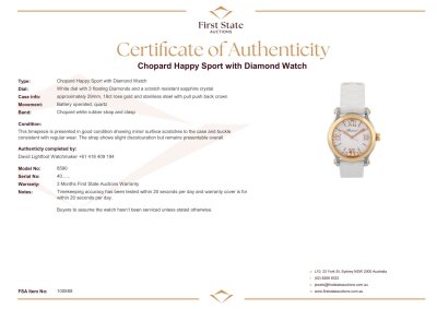 Chopard Happy Sport 18ct rose gold and stainless steel quartz ladies watch. White dial with 3 floating Diamonds, approximate case diameter: 29mm, max wrist size: 18cm, Swiss made. Ref# 8590. With Chopard white rubber strap and clasp. With Certificate of Authenticity and Chopard box. 3 month FSA warranty. Weight: 49.6g