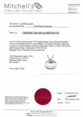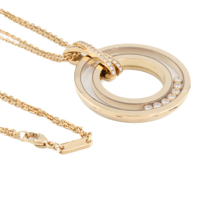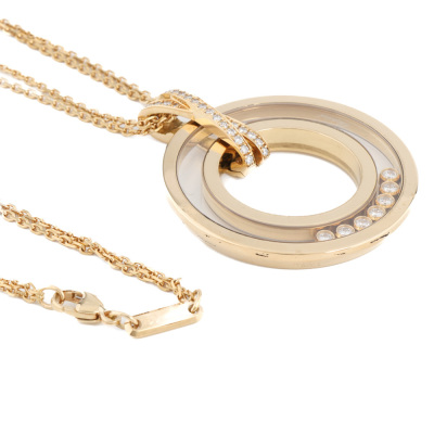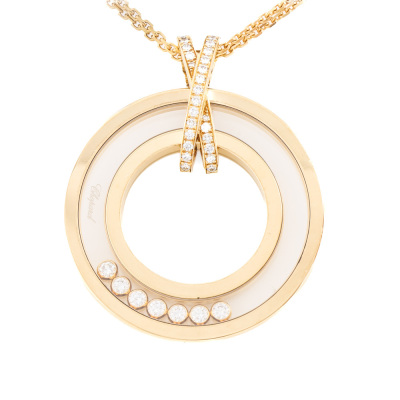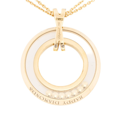 Chopard Happy Spirit Diamond pendant with round Natural Diamonds (including 7 floating Natural Diamonds) totalling 0.35ct (Estimated grading: F-G VS). Motif diameter: 32mm. 18ct yellow gold with Chopard 60cm 18ct yellow gold double chain. Weight: 29.6g. With Chopard inner & outer box. With Certificate #421571. (Pre-owned)