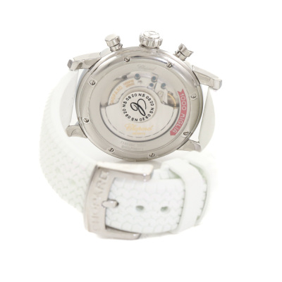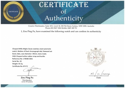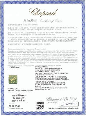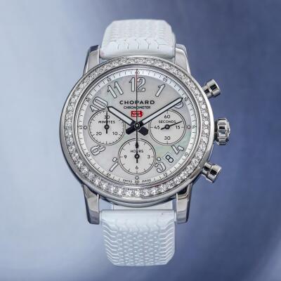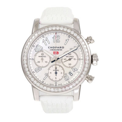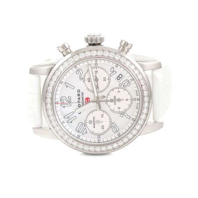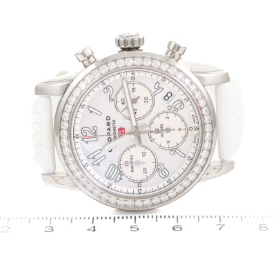 Chopard Mille Miglia Classic stainless steel automatic watch. Mother of Pearl chronograph dial, Diamond set bezel, date, case diameter: 39mm, strap length: 19cm, Swiss made. Ref# 178588-3001. With Chopard white rubber strap and buckle. With Certificate of Authenticity, Chopard Certificate of Origin dated 03/04/2023 and Chopard box. 3 month FSA warranty. (Pre-owned)