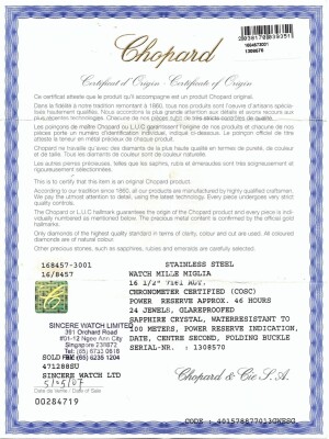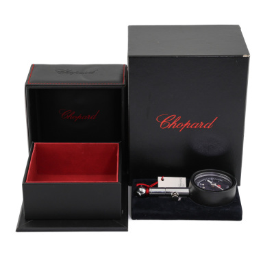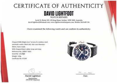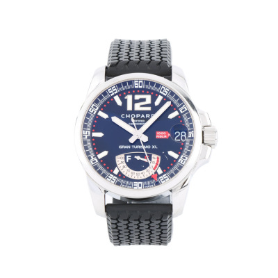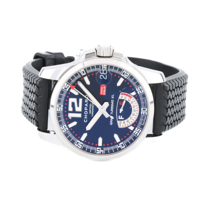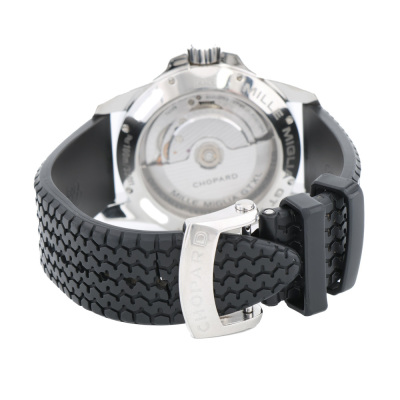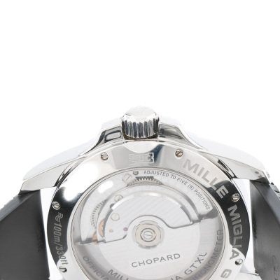 Chopard Mille Miglia Gran Turismo XL stainless steel automatic mens watch. Black dial, date case diameter: 44mm, max wrist size: 20.5cm, Swiss made. Ref# 168457-3001. With Chopard black rubber strap and clasp. With Certificate of Authenticity, Chopard Certificate of Origin dated 05/05/2007 and Chopard box. 3 month FSA warranty. Weight: 144g. (Pre-owned)