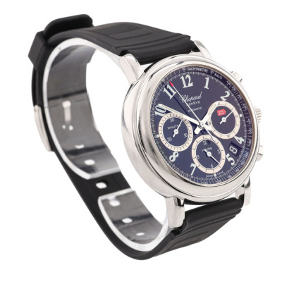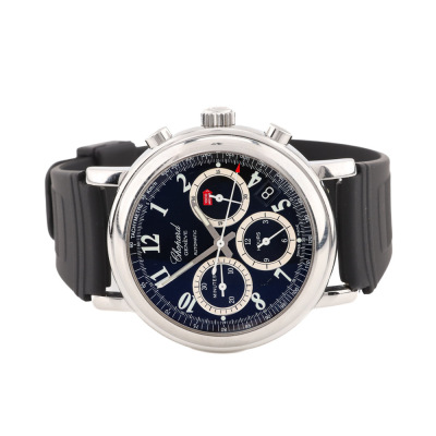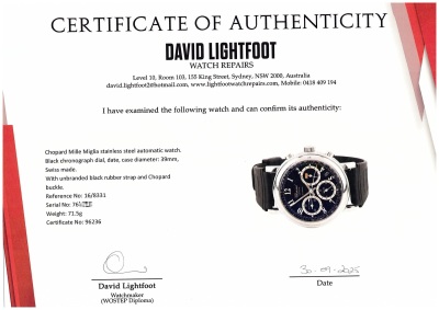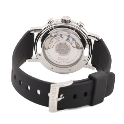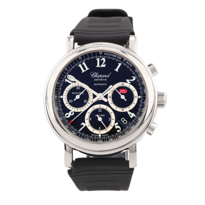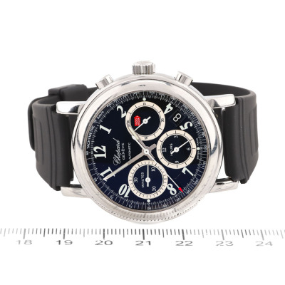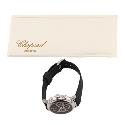 Chopard Mille Miglia stainless steel automatic mens watch. Black chronograph dial, date, case diameter: 39mm, max wrist size: 19.5cm, Swiss made. Ref# 16/8331. With unbranded black rubber strap and Chopard buckle. With Certificate of Authenticity, Chopard Certificate of Origin dated 24/07/2001, spare Chopard black rubber strap and Chopard box. 3 month FSA warranty. (Pre-owned)