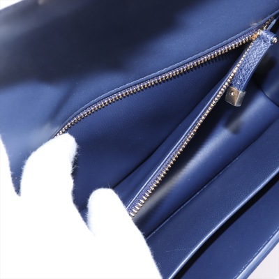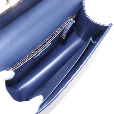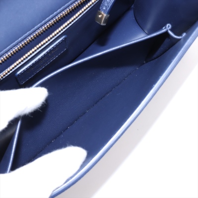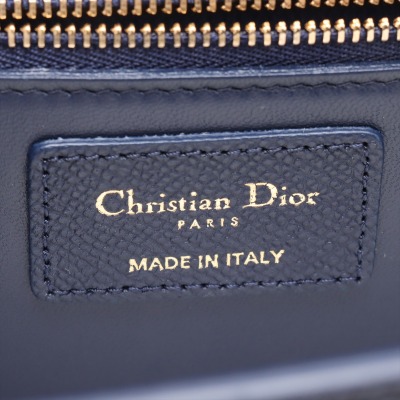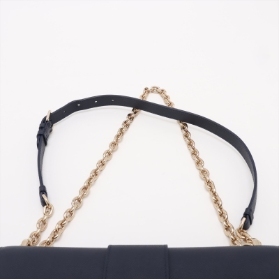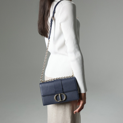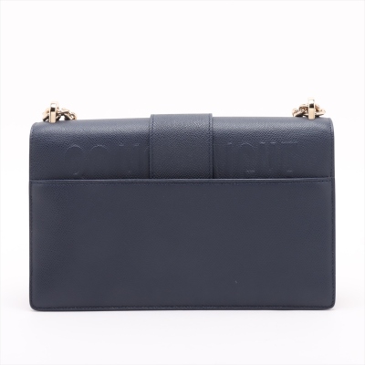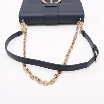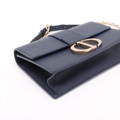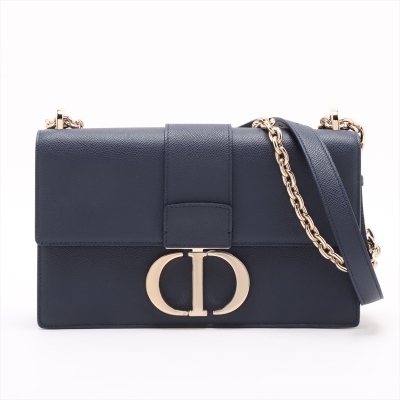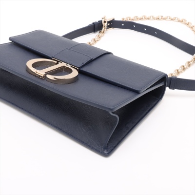 Christian Dior 30 Montaigne East-West Chain bag in navy blue grained leather (circa: 2021). Featuring light gold-toned hardware, embossed '30 MONTAIGNE' signature at back flat pocket, and a detachable chain and leather strap. The flap with 'CD' clasp closure opens to a matching leather lining interior with a patch pocket and zippered pocket. Approx dimensions: 25cm(L) x 16cm(H) x 6.5cm(D), with a 55cm adjustable strap drop. Accompanied by Christian Dior authenticity (unstamped) and care cards. With Entrupy Certificate of Authenticity.