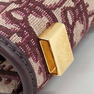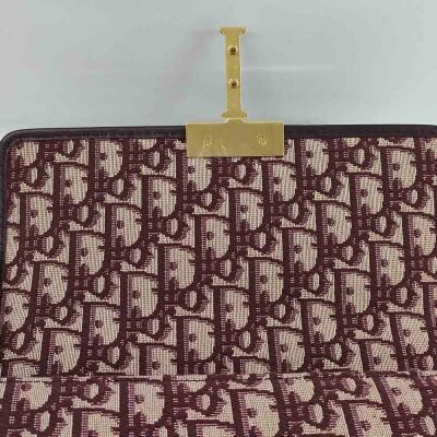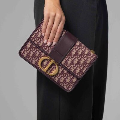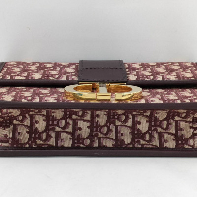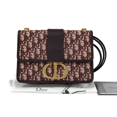 Christian Dior 30 Montaigne bag in maroon Oblique Jacquard canvas with leather trims. Featuring gold-toned hardware, embossed 30 Montaigne signature & an exterior flat pocket at back. The CD clasp on flap opens to a navy textile lining interior with zip and patch pockets. Approximate dimensions: 24cm(L) x 17cm(H) x 6cm(D), single strap drop 52cm. Accompanied by Dior certificate card (dated 13/05/19) and dustbag. With Entrupy Certificate of Authenticity. (Pre-owned)