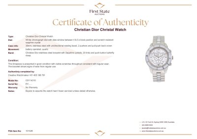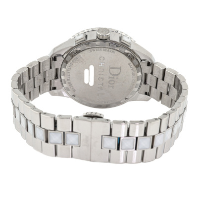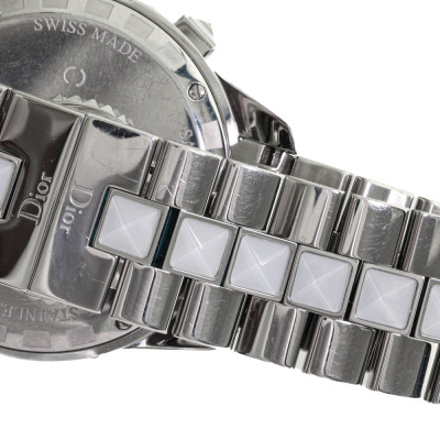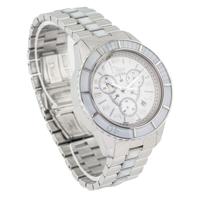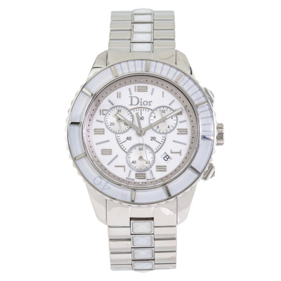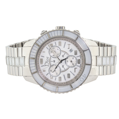 Christian Dior Christal stainless steel quartz watch. White chronograph dial, date, case diameter: 38m, wrist size: 19.5cm, Swiss made. Ref# CD114310. With Christian Dior stainless steel bracelet with white Sapphire crystals and clasp. With Certificate of Authenticity and Christian Dior box. No warranty applies. Weight: 140.8g.