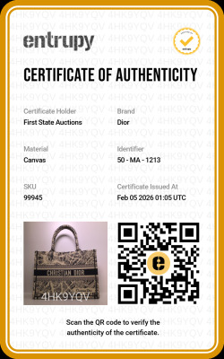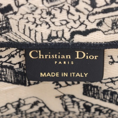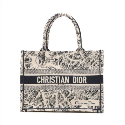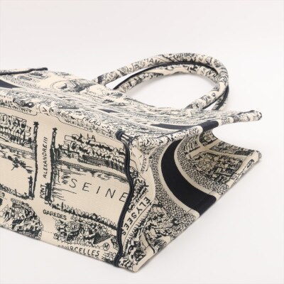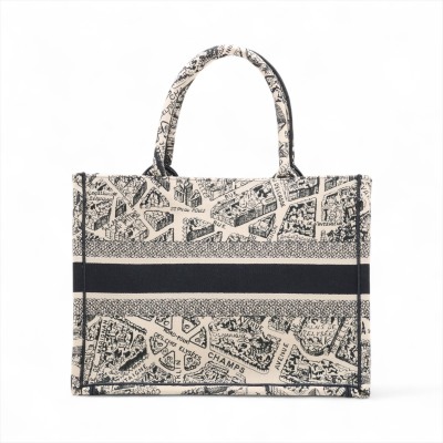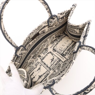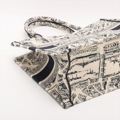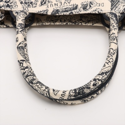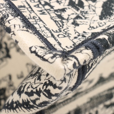 Christian Dior medium book tote bag in navy and ivory colour canvas (circa: 2023). Featuring full embroidery with Plan de Paris pattern, adorned with the 'CHRISTIAN DIOR PARIS' signature on the front, and rolled canvas top handles. The top opens to a spacious fabric interior. Approximate dimensions: 36cm(L) x 27cm(H) x 16cm(D), and a 15cm handle drop. Accompanied by a Dior authenticity card and dustbag. With Entrupy Certificate of Authenticity.