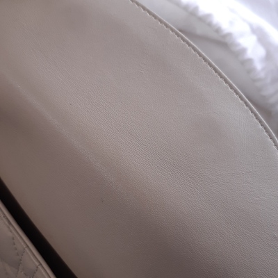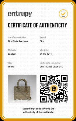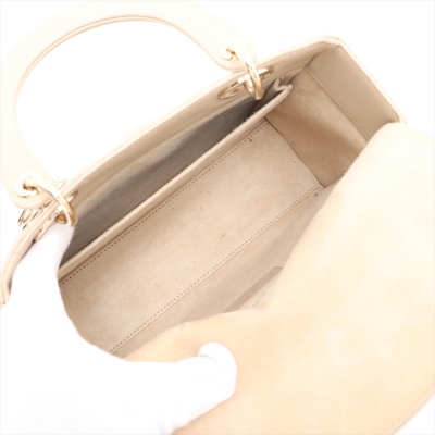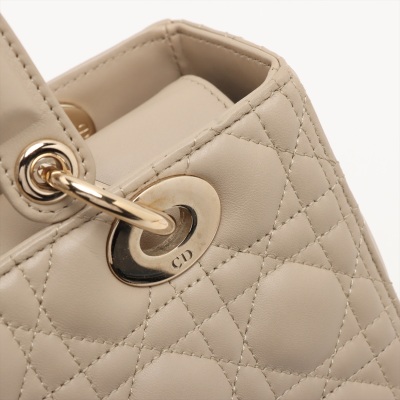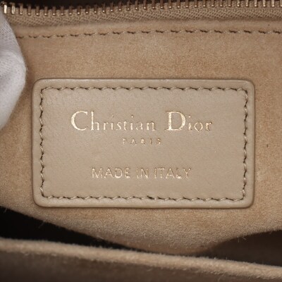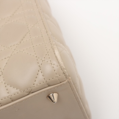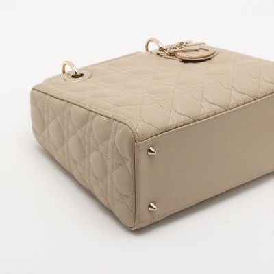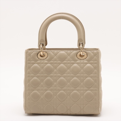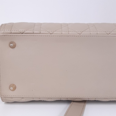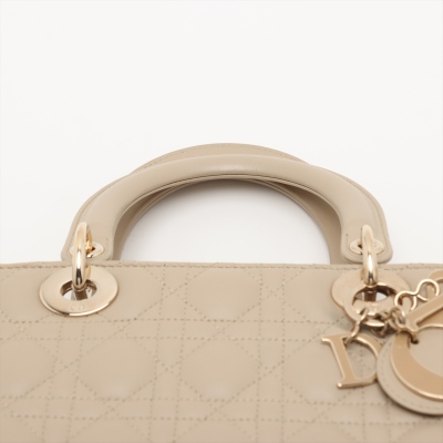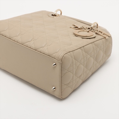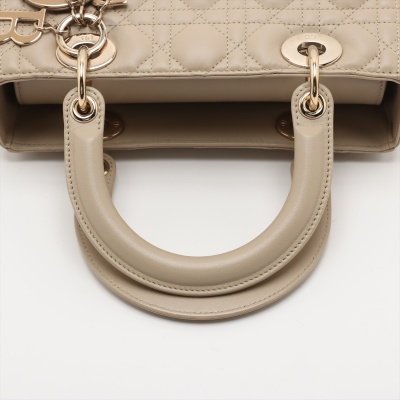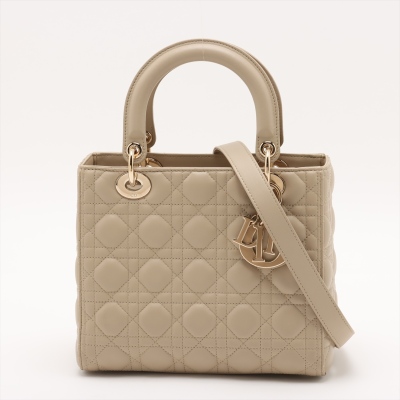 Christian Dior medium Lady Dior bag in beige lambskin leather with Cannage quilting. Featuring gold-toned hardware, leather top handles & 'DIOR' charms at front. The folding flap closure on top opens to a beige suede interior with zip and patch pockets. Approx dimensions: 24cm(L) x 20cm(H) x 11cm(D), handle drop 10cm & detachable & adjustable strap drop 60cm. Accompanied by Dior card (dated 01/2022), dustbag, box & Lady Dior books. With Entrupy Certificate of Authenticity. (Pre-owned)