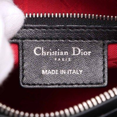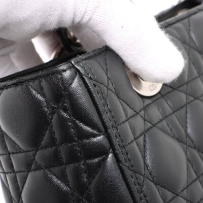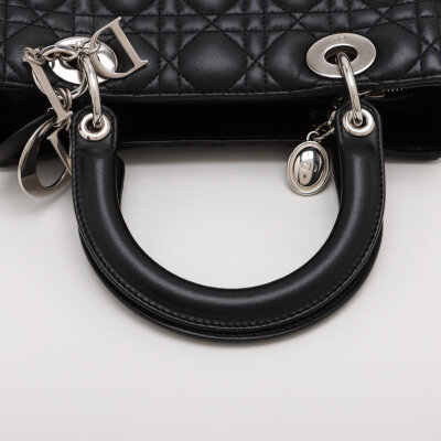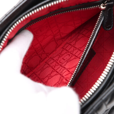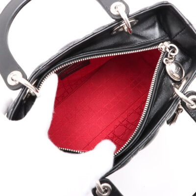 Christian Dior medium Lady Dior in black leather with Cannage quilting (circa: 2014). Featuring silver-toned hardware, 'Dior' leather charms at front, leather handles, a detachable leather strap and CD oval zip closure. The top opens to a red textile Cannage-lined interior with a zippered pocket. Approximate dimensions: 23.5cm(W) x 20cm(H) x 12cm(D), with a 10cm handle and 45cm strap drop. With Entrupy Certificate of Authenticity.