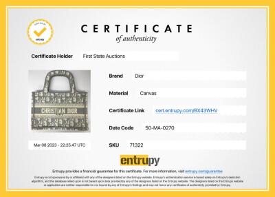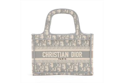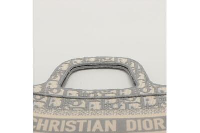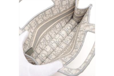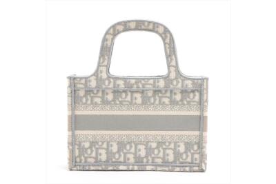 Christian Dior mini book tote bag in canvas, fully embroidered with grey Dior Oblique motif. Adorned with the 'CHRISTIAN DIOR PARIS' signature on the front. Approximate dimensions: 22.5cm(L) x 15cm(H) x 6cm(D), 7.5cm handle drop height. Accompanied by Dior dust bag. With Entrupy Certificate of Authenticity. (Pre-owned)