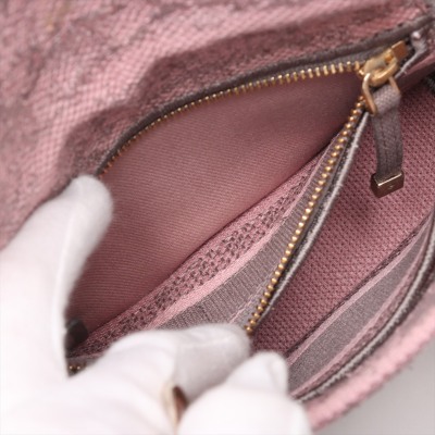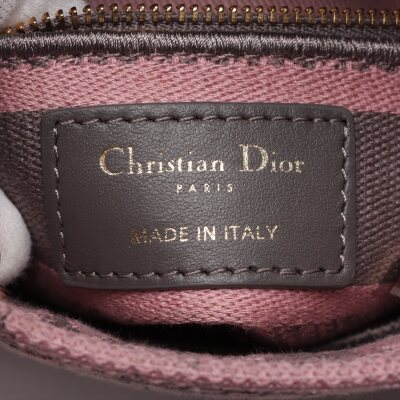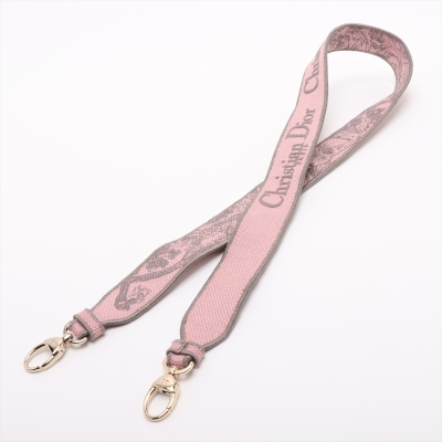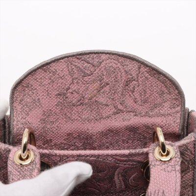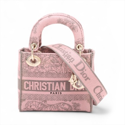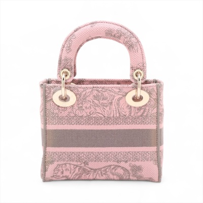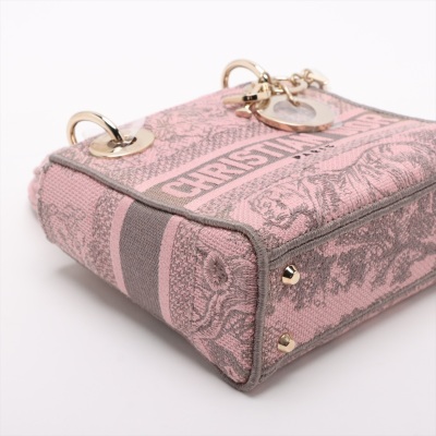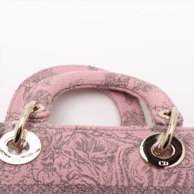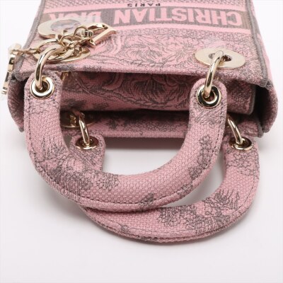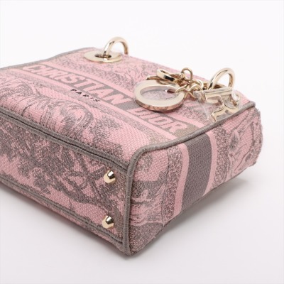 Christian Dior Mini Lady D-Lite bag in pink and grey Toile De Jouy jacquard canvas (circa: 2023). Featuring 'Christian Dior' signature on the front, fabric top handles, a detachable and reversible wide strap, champagne gold-toned hardware, and Dior letter charms. The top flap opens to a matching canvas lined interior with a zippered pocket. Approximate dimensions: 17cm(W) x 14cm(H) x 7cm(D), with a 7cm handle drop and 42cm wide strap drop. With Entrupy Certificate of Authenticity.